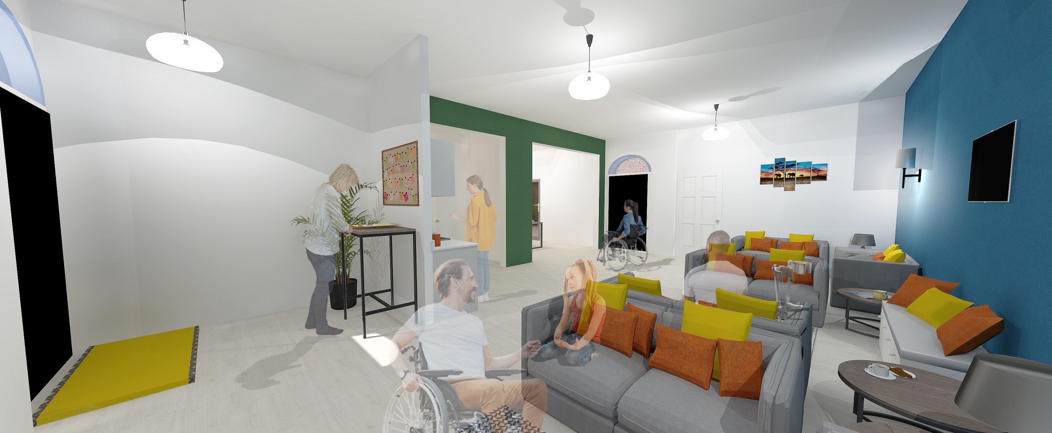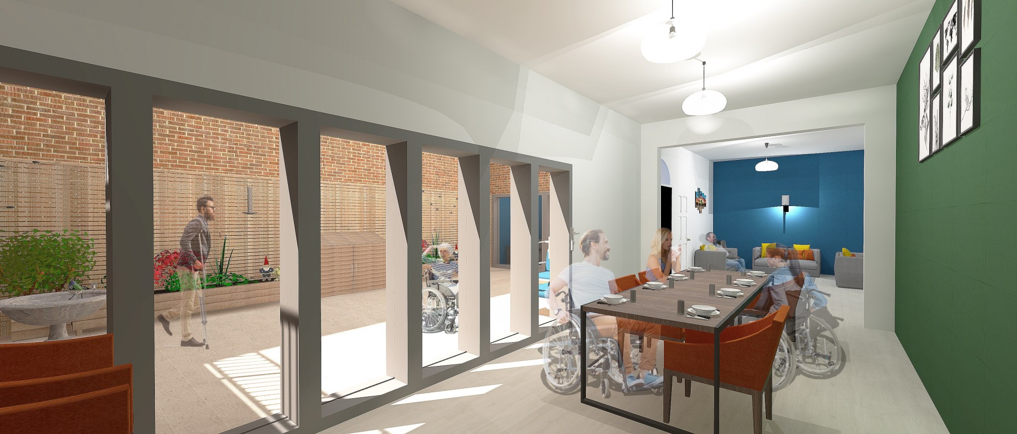 The social dining space where residents can all sit together on one central table for a homely feel. Family and friends also have the option to join residents for meals. This space over looks the garden with the bi-fold doors and is connected to the family room and kitchen for short journeys with food and drinks. It is a flexible area so that chairs can be placed wherever is necessary for wheelchair users.