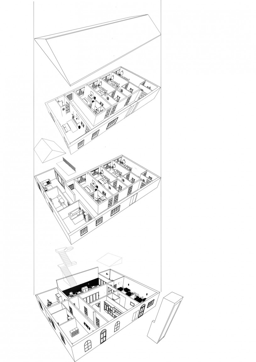 The relationship between all three floors of the building with the external lift, stairs, balcony and different spaces.