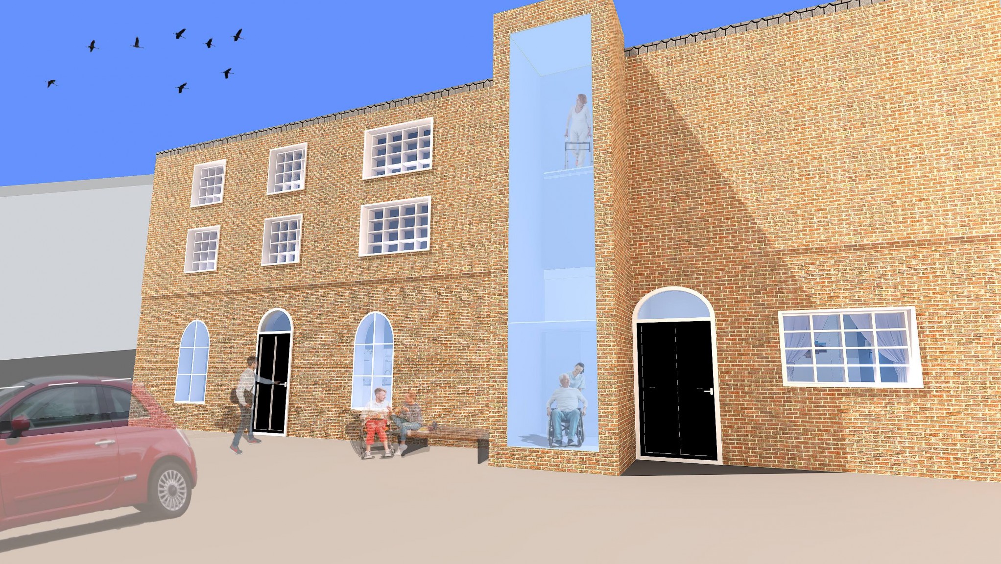 The relationship between the facade of the building, the surrounding context outside and the additional external glass lift.
