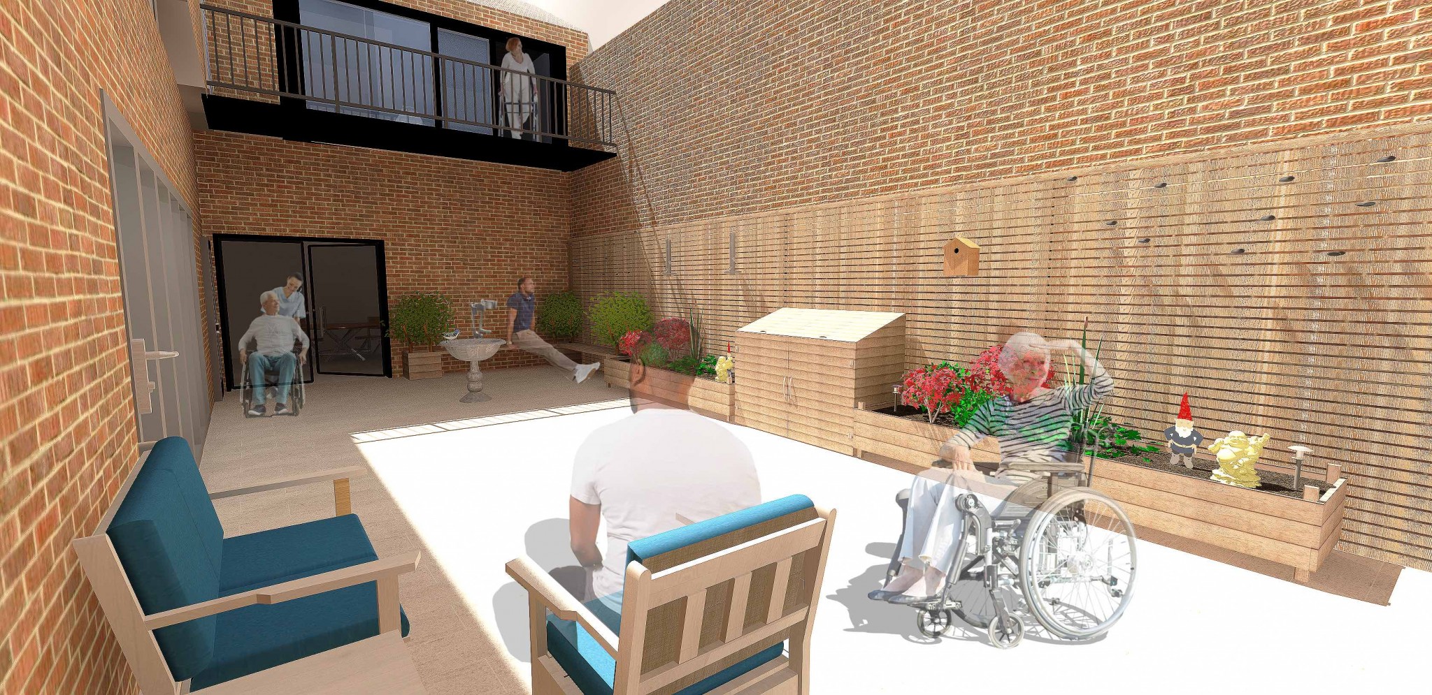 The private outdoor space, like a garden at home. Residents can connect with nature and relax outside, feed the birds and enjoy some gardening with the raised planter beds. The accessible garden can be seen from the balcony above and from the rooms downstairs with the large glass doors.