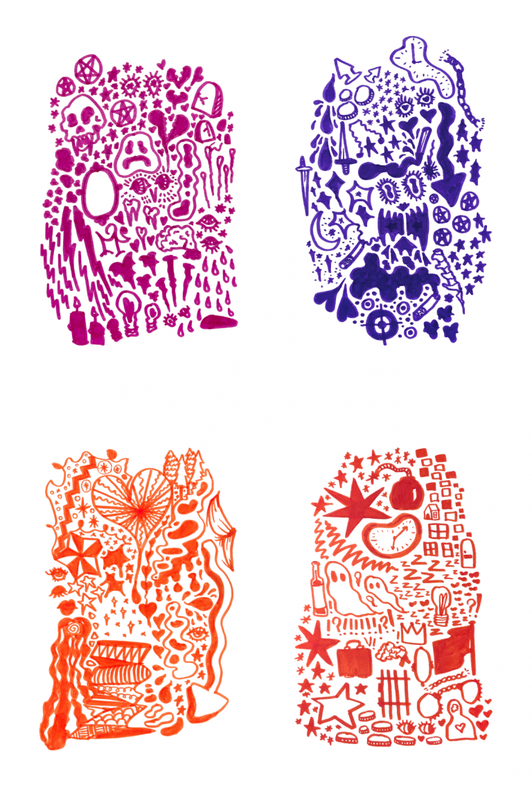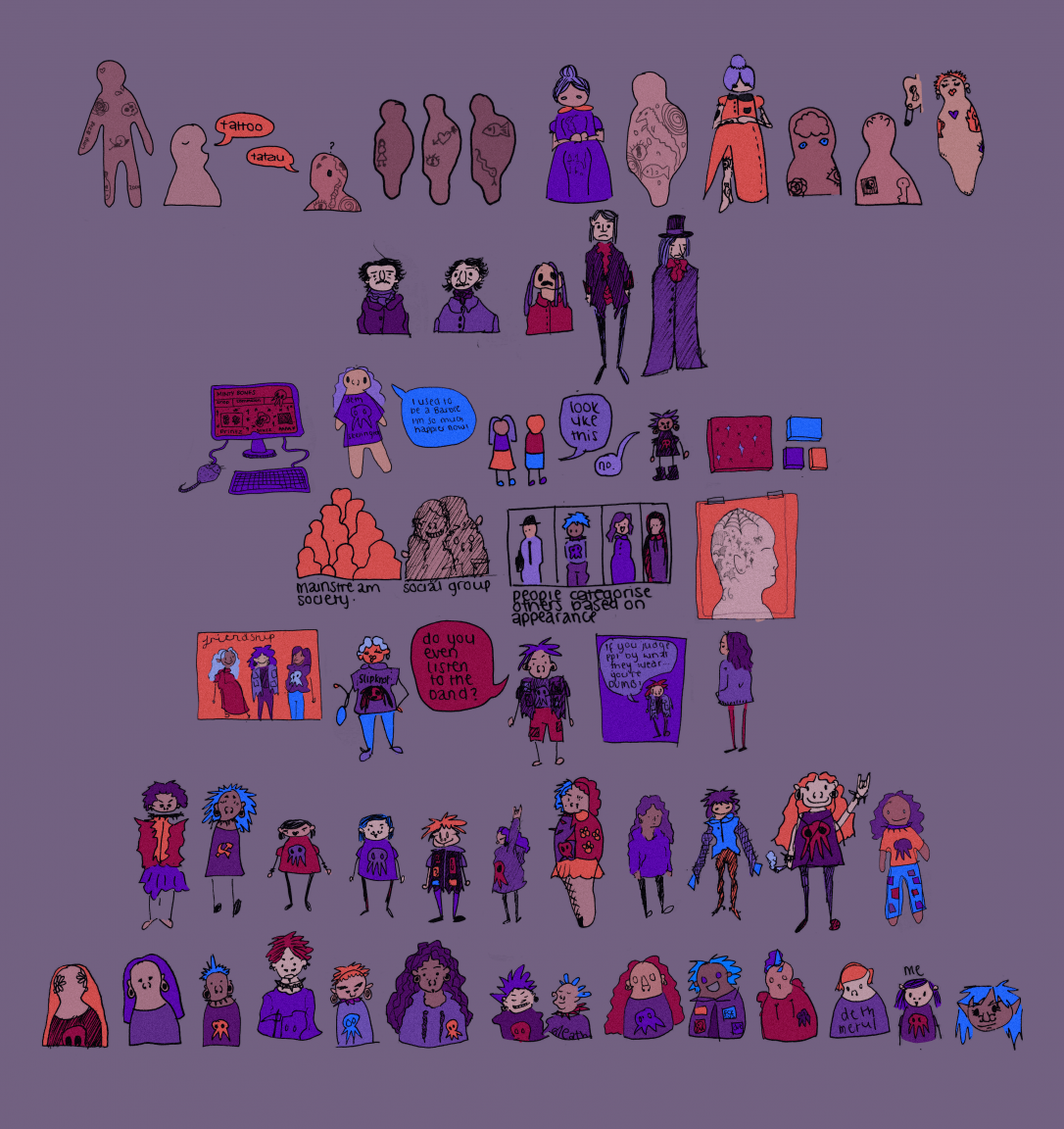 This piece is a cumulation of the illustrations done in Minnie Jones’ research sketchbook for her self directed brief. This open brief was an exploration of body modification through history, to contemporary attitudes towards modification and modified people, as well as a wider look on alternative people and subcultures. Originally this was never intended to become a finished illustration, it was meant to be more of a personal commentary and illustration of the artist’s research notes. It became clear there was strength and character in many of the drawings so they were compiled into a project. The natural order of the notes reflects a loose chronological order within the piece. Reading from top to bottom, we see the history of modification, alternative people in the media, societal attitudes and a collection of contemporary alternative people. It is not necessary to read the piece in this way however, it can be considered more of an overview and celebration of subcultures throughout time. The colours were selected as a contrast from the convention image of subcultures, Jones chose bright and jubilant colours to suit the tone of the artist’s attitude towards subcultures. This piece then inspired the creation of a publication following the same philosophy, a compilation of research in order to educate and inform a wider audience on the history of subcultures.