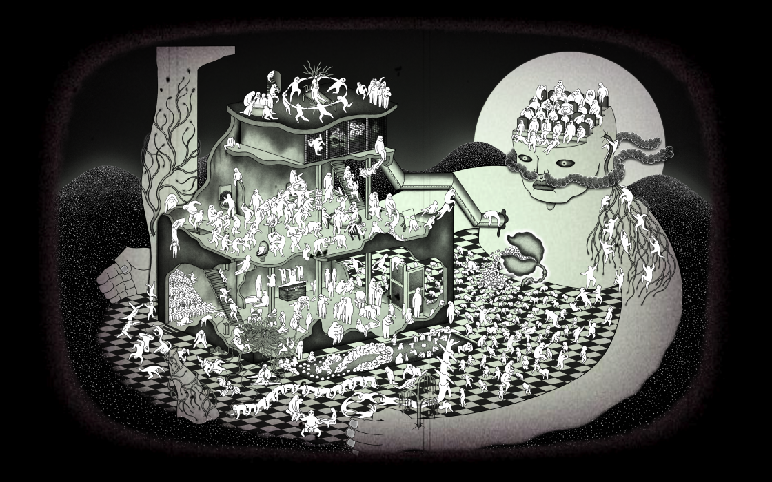 The first painting is Wang’s state of severance. It includes the severed version of Wang in different ages—they create a life circle in this state. The womb of the statue grows from the ground and create lives, they grow and entertain themselves in this space, till they run out of vitality, their corpses will be sent to the statue and he will eat and digest them and become source of vitality. The second painting is the real state of Wang’s, facing the reality that they are alone in this space. When we put these two paintings in comparison, you can find the place where the womb blooms is the place where the real Wang sits, that implies all of these people are come from their imagination.