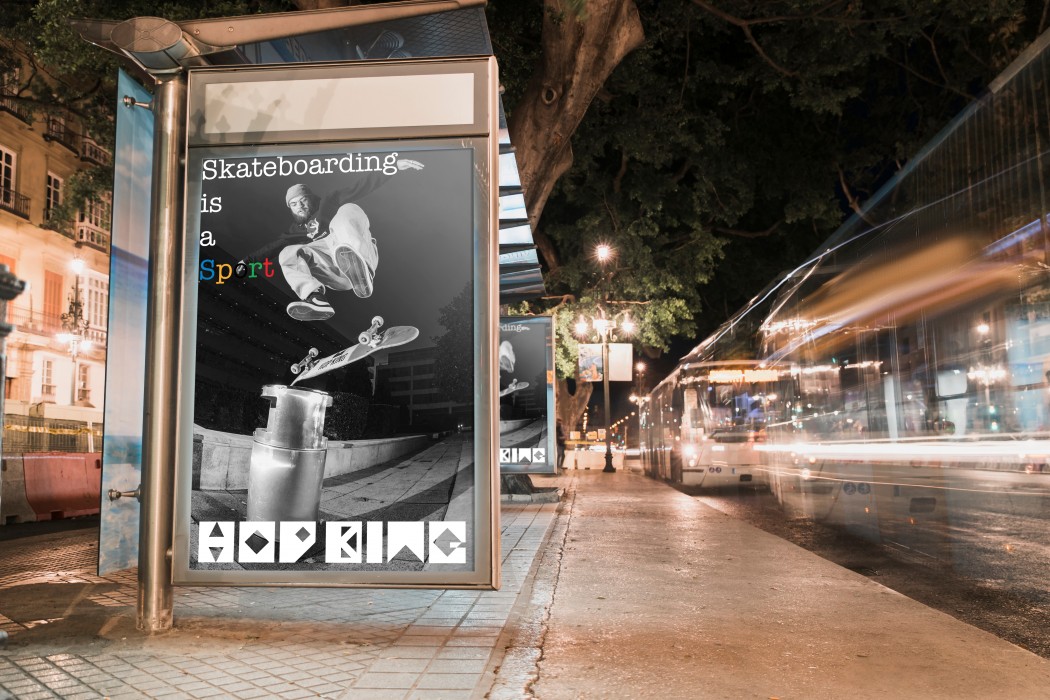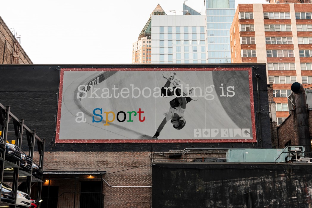 George Beckett‘s project was created to show the public that skating is an Olympic sport, not a crime. It was created as a collaboration with the brand HOPKING because they sponsor the UK’s number 1 ranked male skater and team GB skater Alex Decunha. Beckett was influenced by the old Thrasher magazine style, of having a black and white style photo behind the text, and a logo over the top. “Skateboarding is a sport” uses the five-letter word sport to match the five Olympic rings, with each letter the same as each colour of the rings.