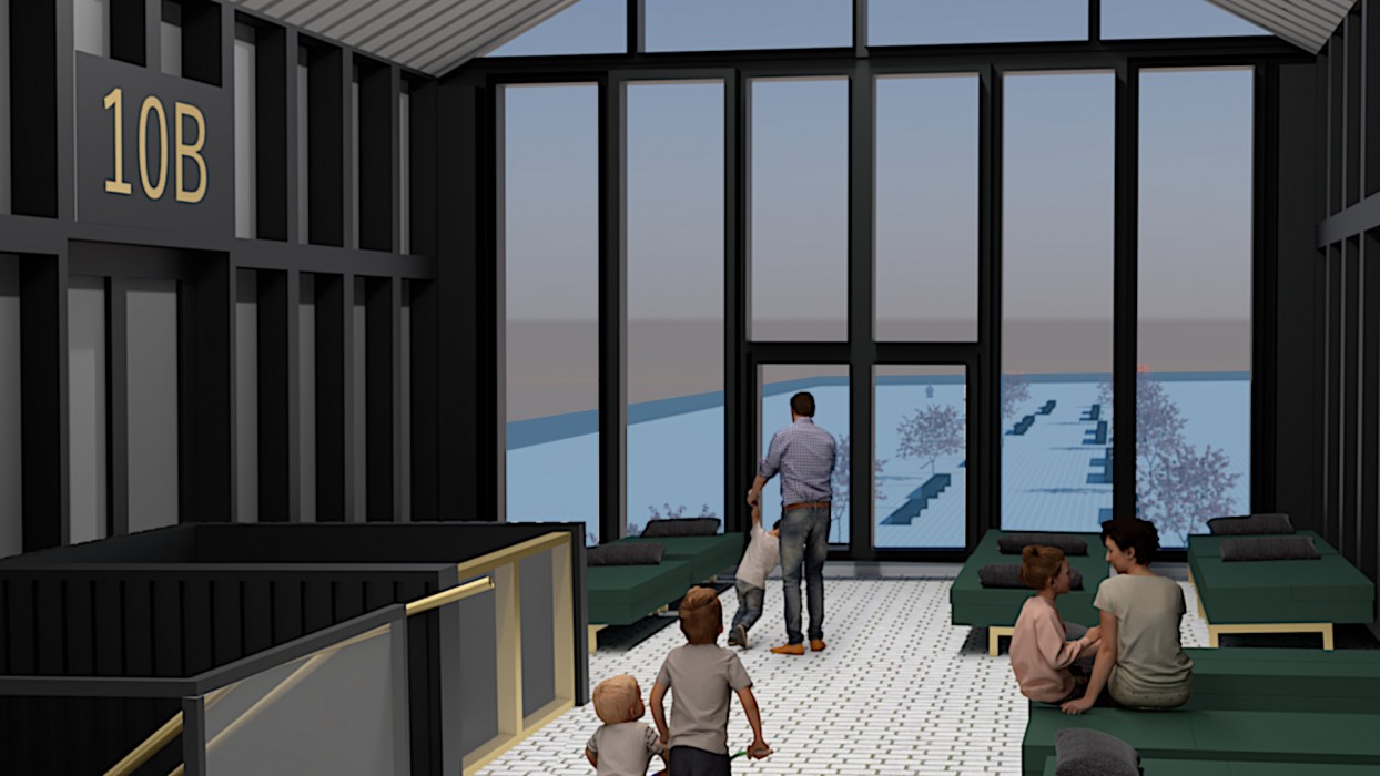 To avoid damages caused by these extreme weather events, the interchange will compact telescopically into the main building before the flooding. The furnishings will adapt depending on the required usage of the space. The colour scheme in the interchange and the evacuee shelter will have colours and materials that are associated with luxury to provide the users with a sense of calm and comfort during this stressful time.