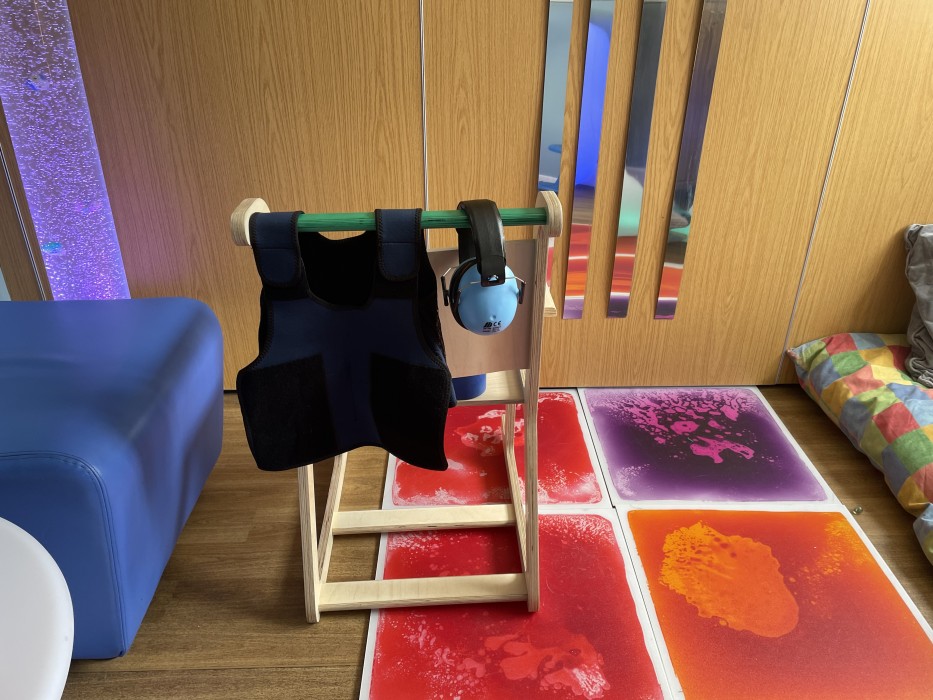 The chair includes a rocking feature that children can use to receive sensory feedback, as well as a hanging rail for other specialist products such as ear defenders and weighted vests.