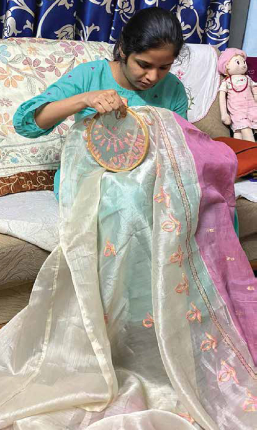 Camasamudram Madurima has explored vernacular and temple architecture in Tamil Nadu as a source of inspiration for contemporary interior design and making good use of traditional architectures inherent sustainability. To illustrate this, Madurima has combined wall hanging, wood carving and embroidery – using traditional techniques and new technologies in a partition for a wedding boutique.