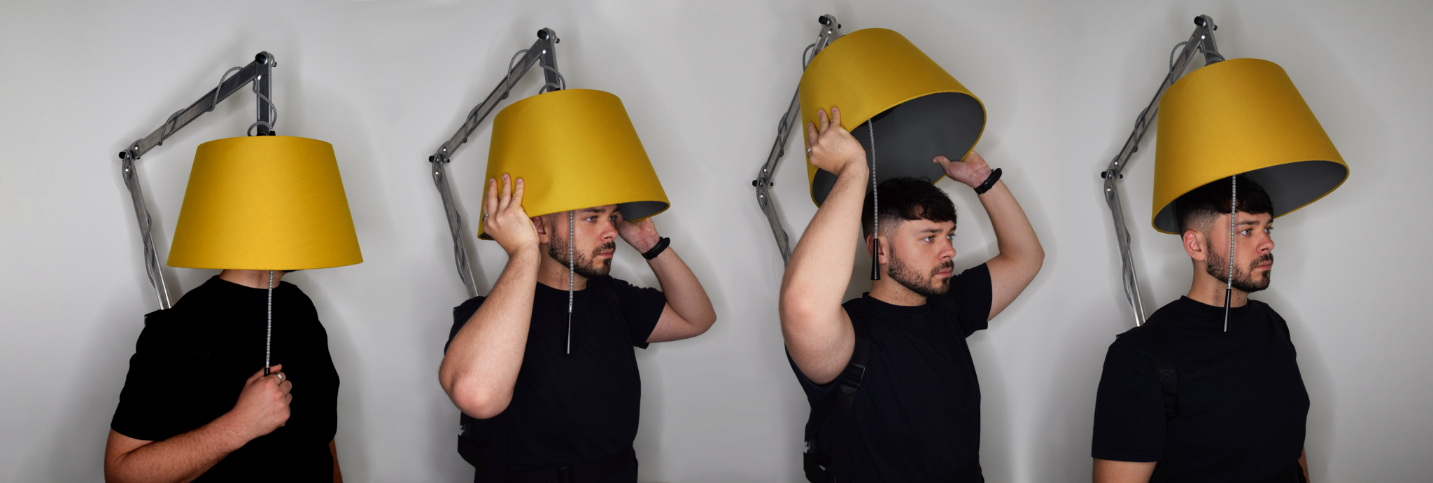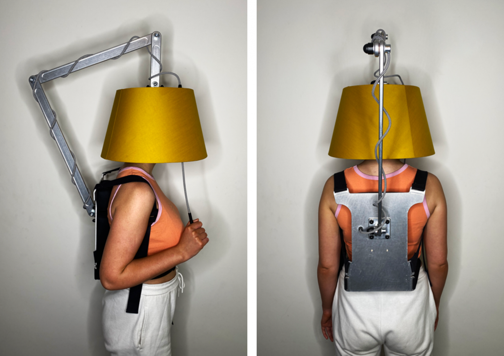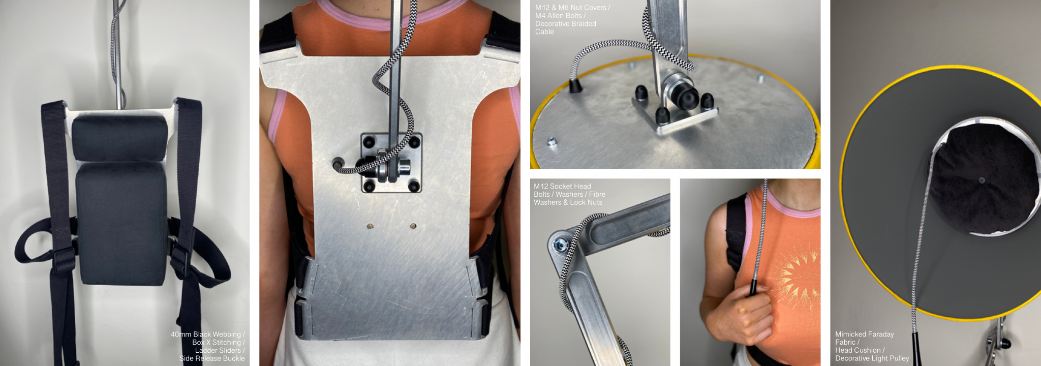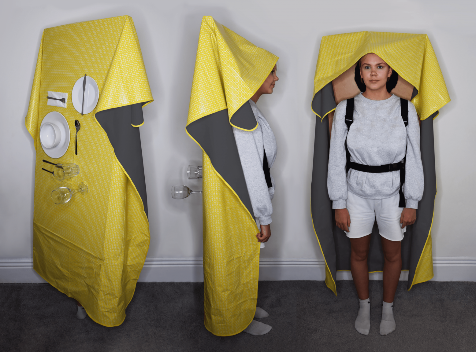 The physical outcomes are satirical, but functional forms of protection are created and used by individuals in this future to disconnect from the technological world and momentarily escape the stress their job brings. The objects occupy and disorientate the user, making it impossible to perform other tasks. The lampshade and tablecloth have a Faraday material incorporated into them that blocks 99.99% of radio frequencies, meaning technology has no way of reaching the user and tempting them to overwork. In the present, these humorous objects act as tools that support this project and foreshadow a future that could exist if business leaders continue to fail to recognise the benefits of investing in well-being at work.