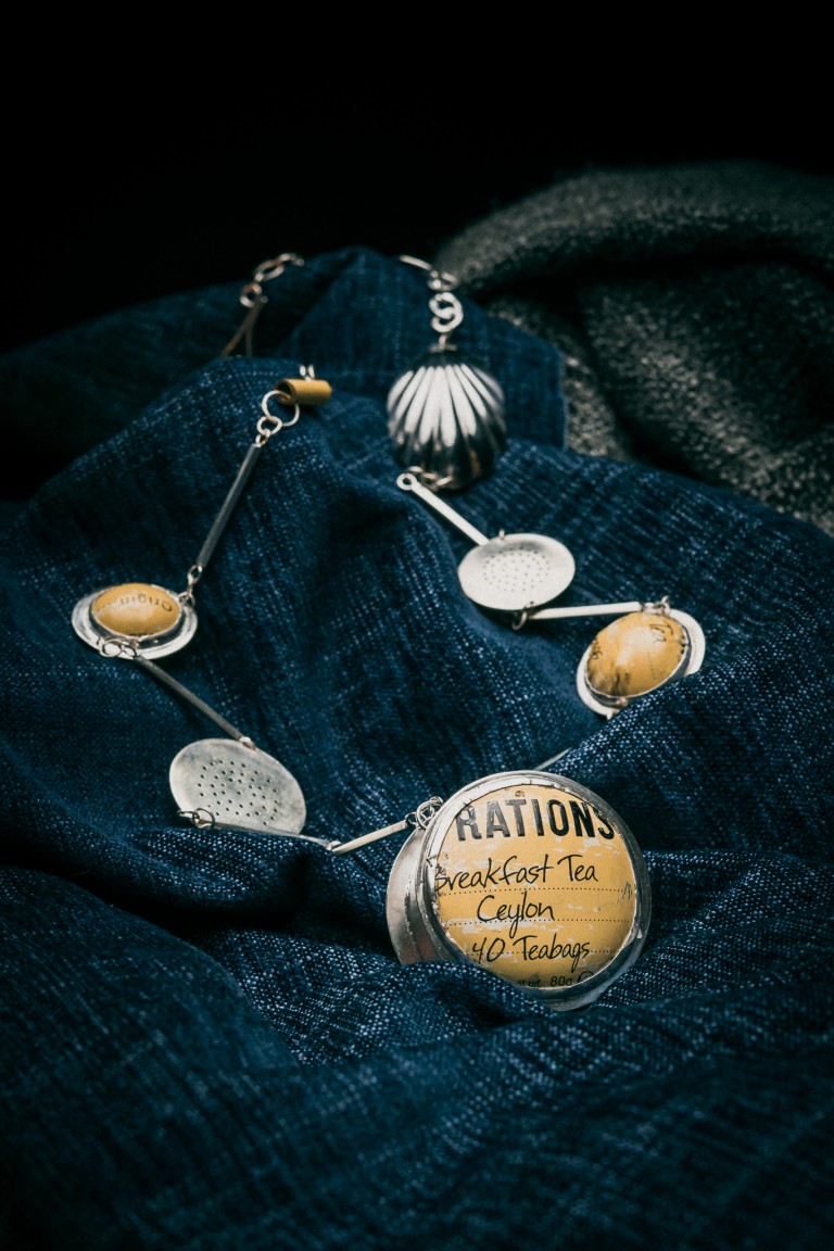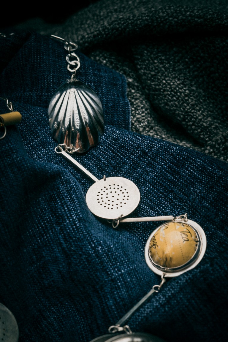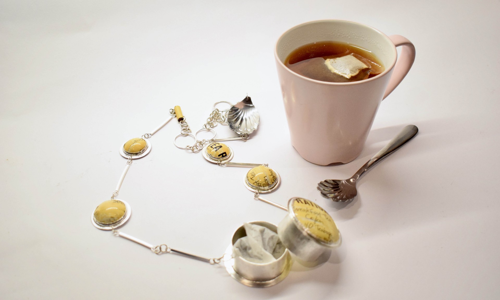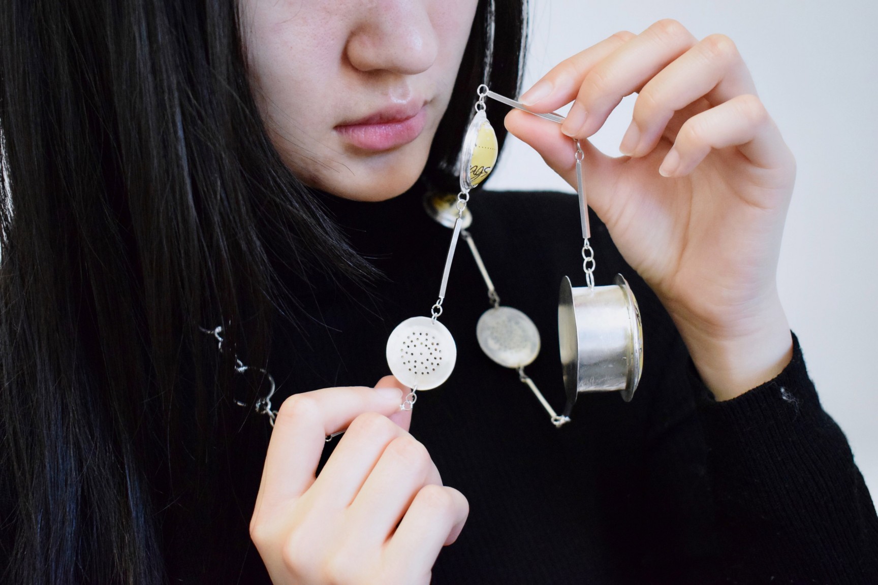 Zhu Ping’s work is titled ‘Tea Ceremony’. The main material in the work is reclaimed tea cans, used to store flavoured herbal tea, in combination with silver used to structure the piece. The purpose of the jewellery is to remind Ping of happy moments in their life. When Ping was young, they didn’t realise the preciousness of spending time with family and friends – even just in sharing a simple cup of tea. Now, having grown up and studying in other cities, even abroad, Ping has discovered that their family and friends cannot stay with them all the time. This jewellery helps to remind Ping to cherish the moments they spend with them as much as possible. Ping hopes to use jewellery to tell stories such as these, to help viewers recall their own precious memories, and remember the happiness they have in their hearts.”