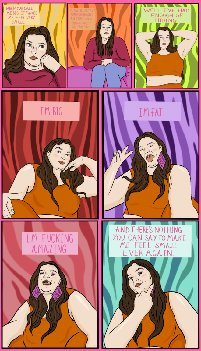 Dales is deeply inspired by social activism movements and feminism, and likes to use her voice in her work, even if it does “ruffle a few feathers”. She created a colourful digital comic on body confidence to encourage herself and others. She has also made political statements through embroidery and digital design, in her ‘Eat the Rich’ project. In the future, Dales plans to continue making art that is important to her.