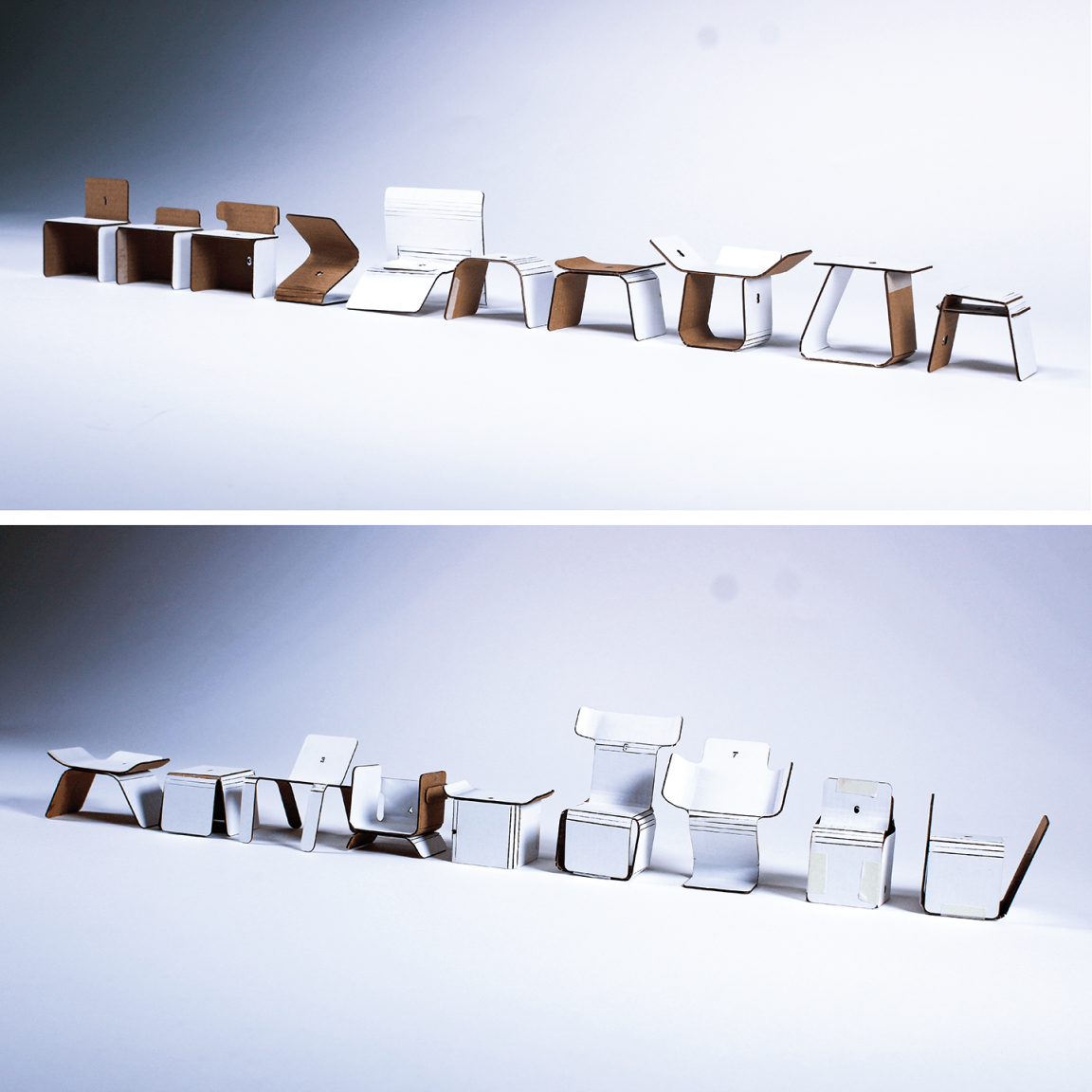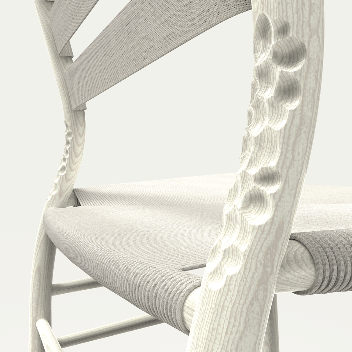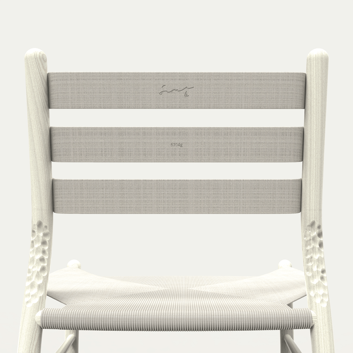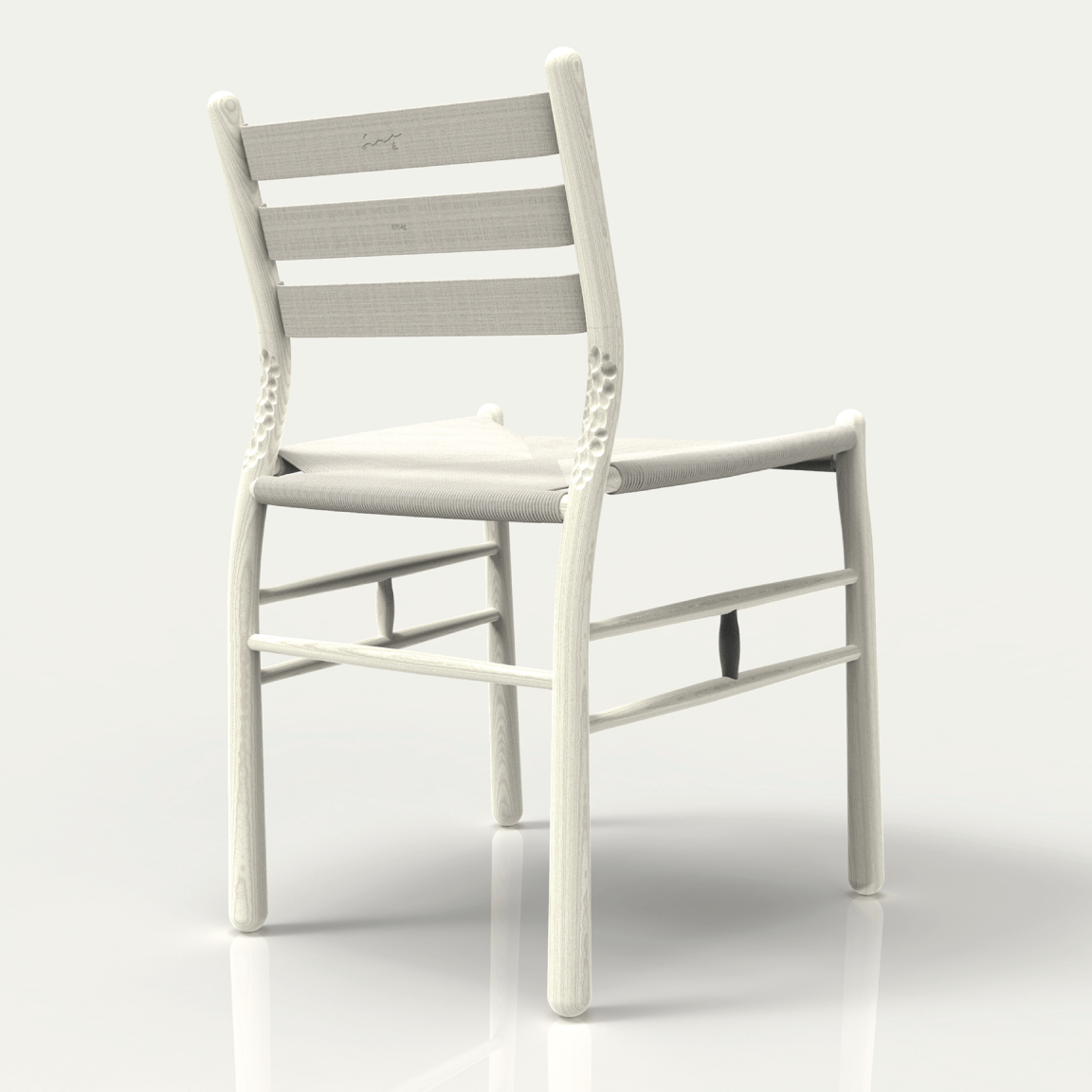 The chair embodies physical and emotional durability: crafted gouge marks on the rear uprights emphasis the sensory relationship with its owner – as they come into contact with the chair again and again over time, a suggestion of a same journey handed down to future generations. A small off-cut spindle found between both side stretchers represents re-purposed leftover coppiced timber, one of which is painted with a flax seed oil-based bio-char paint created from flax cord, linen and timber scraps, left over from the chair’s construction. Renewable heat energy produced from the bio-char stove is then used to heat the water to steam bend the coppiced timber components. Each of the three backrest plates are made from a flax linen bio-resin composite, branded with the total carbon storage of the chair – ‘6704g’.