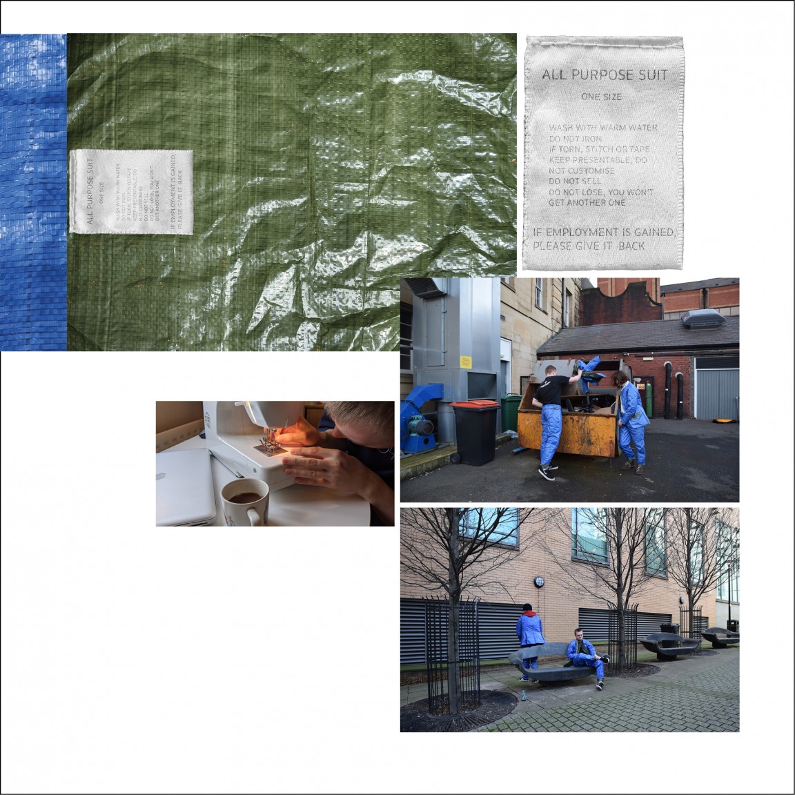 A futuristic, government response to homelessness in which people in need are given an all purpose, weather-proof, formal suit, forms the outcome of Max Armstrong’s research into fashion for protest – and a protest itself. The All Purpose Suit provides warmth, protection, and also formal interview attire – and is a response to by a close family member’s involvement in homeless support work and what Armstrong’s own observations in Sheffield.