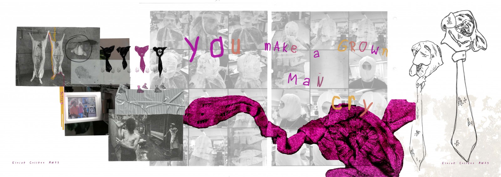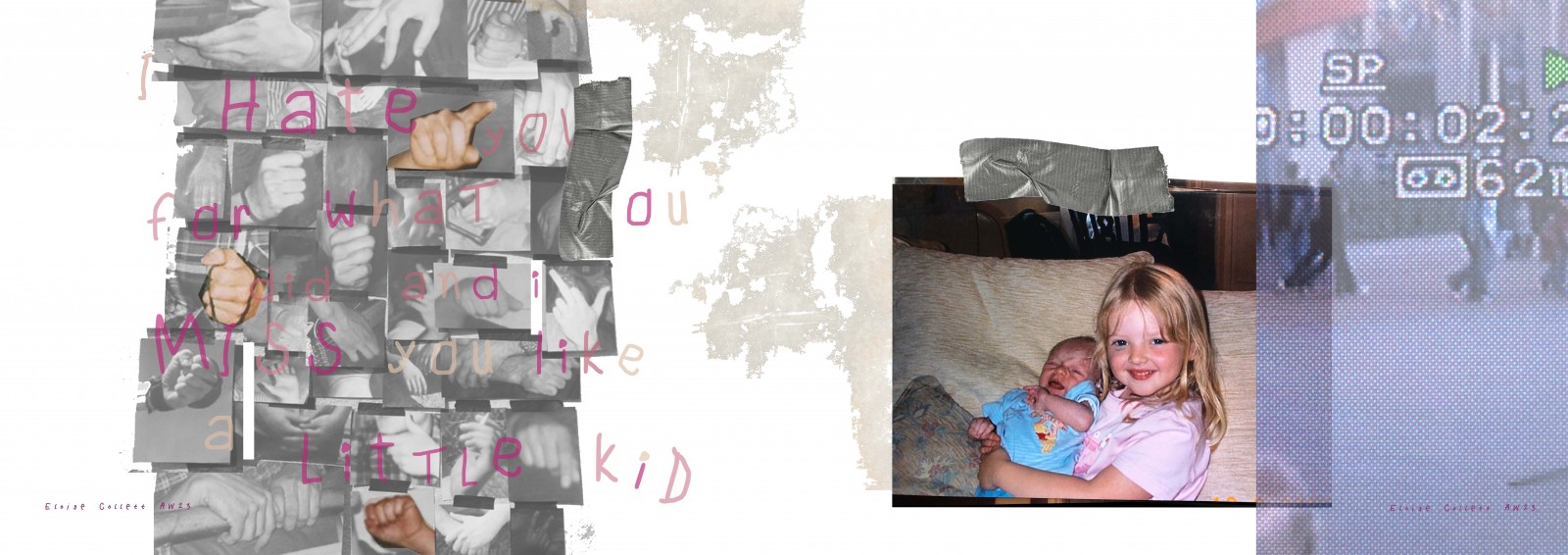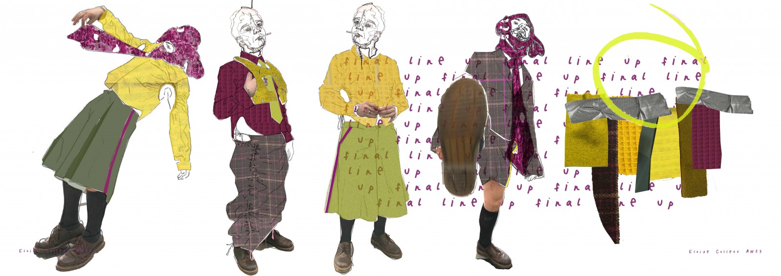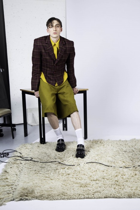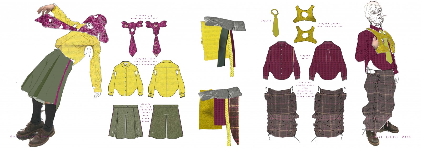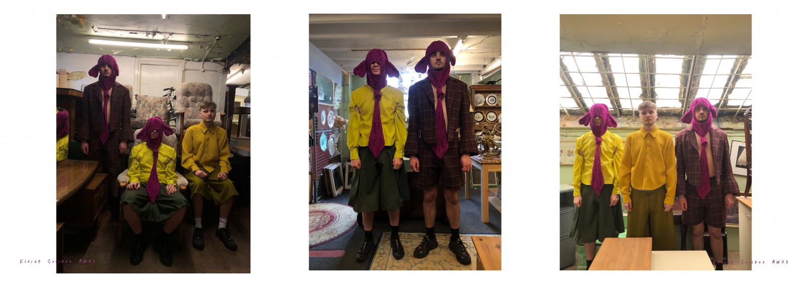 Eloise Collett’s graduate collection ‘The Baby Blues’ pays homage to her heritage and upbringing with an alcohol abusive father. She has compiled her whole life’s journey into this year-long project as a form of self-healing and giving representation to the girl who lives inside her that never got to speak this truth without fear of rocking the boat. Her collection’s tone is dark and muddy with pink accessories. She wanted to grasp the waves of fear and sadness that came with a parental dynamic like hers, whilst maintaining the reminder of innocence and childhood.