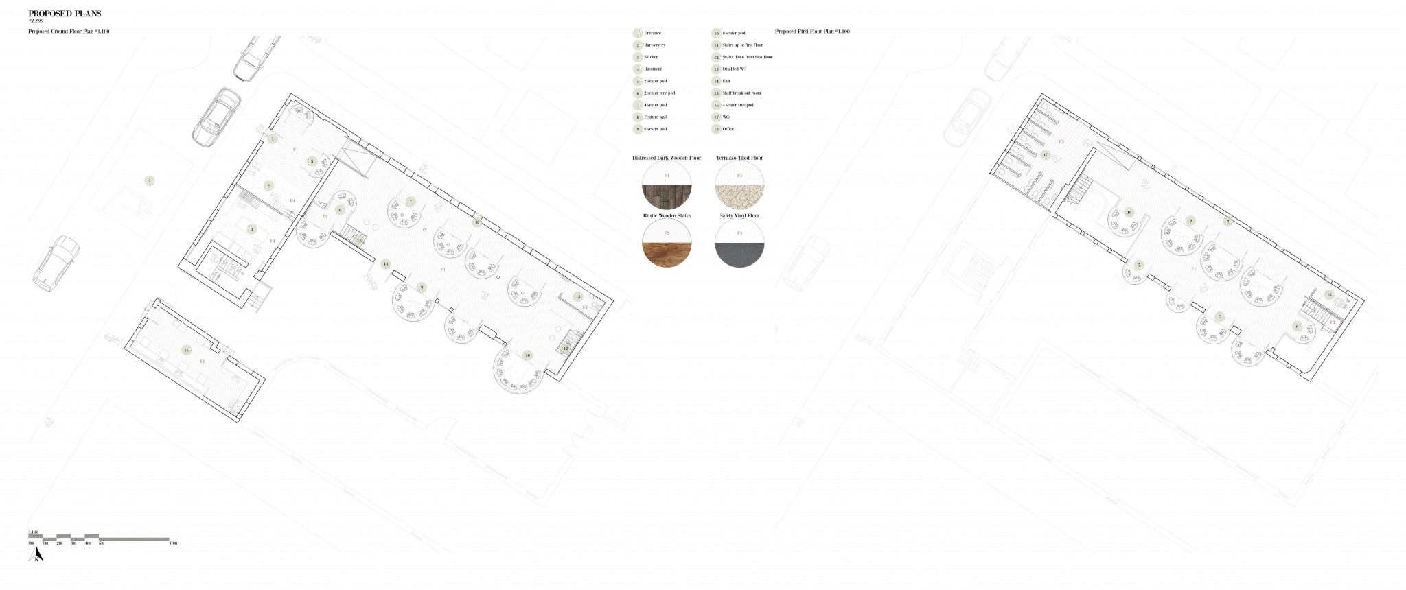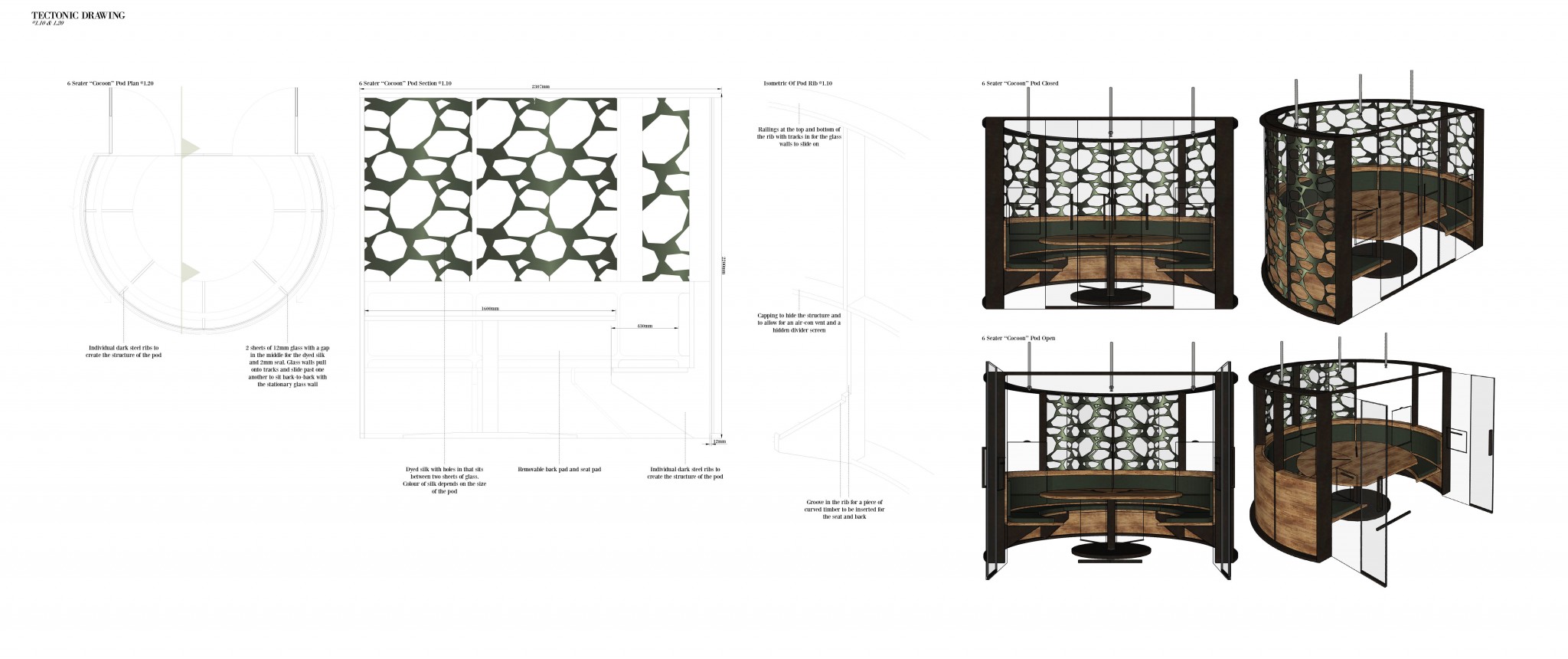 Ground and first floor plans of bar space including the placement of the cocoon pods.