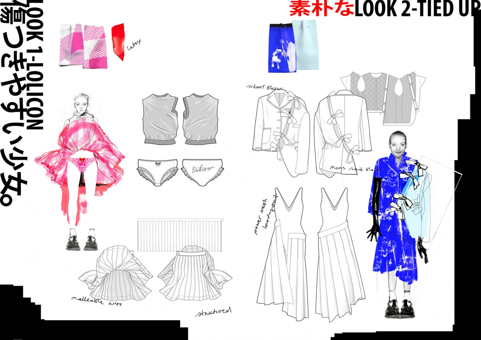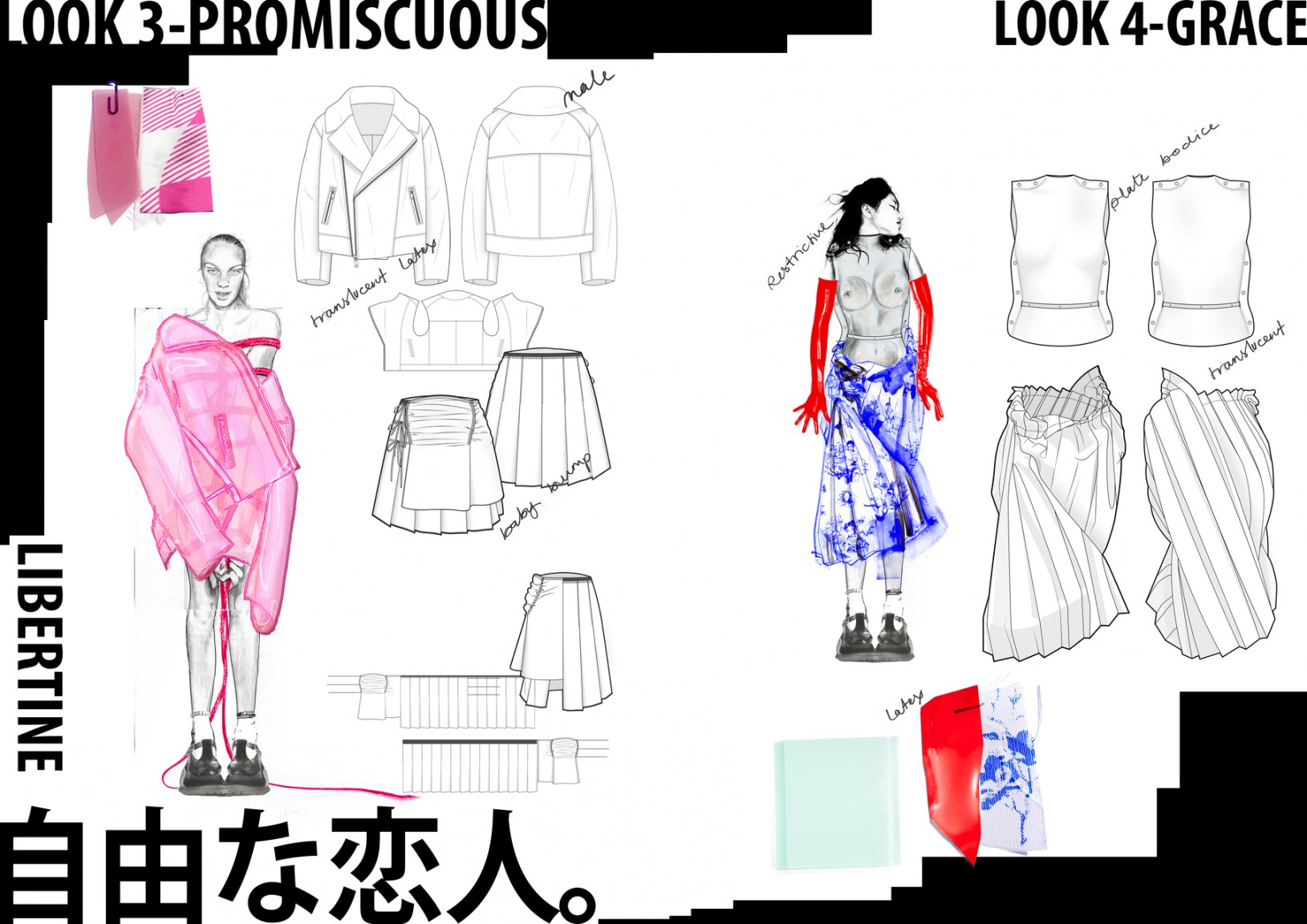 Coggin Levy’s is a concept-focused designer, sourcing inspiration from art, music, literature, and film to build a fleshed-out narrative. Her background in tailoring gives her the skills to develop her concepts. She has been a design intern at Vivienne Westwood Man, London.