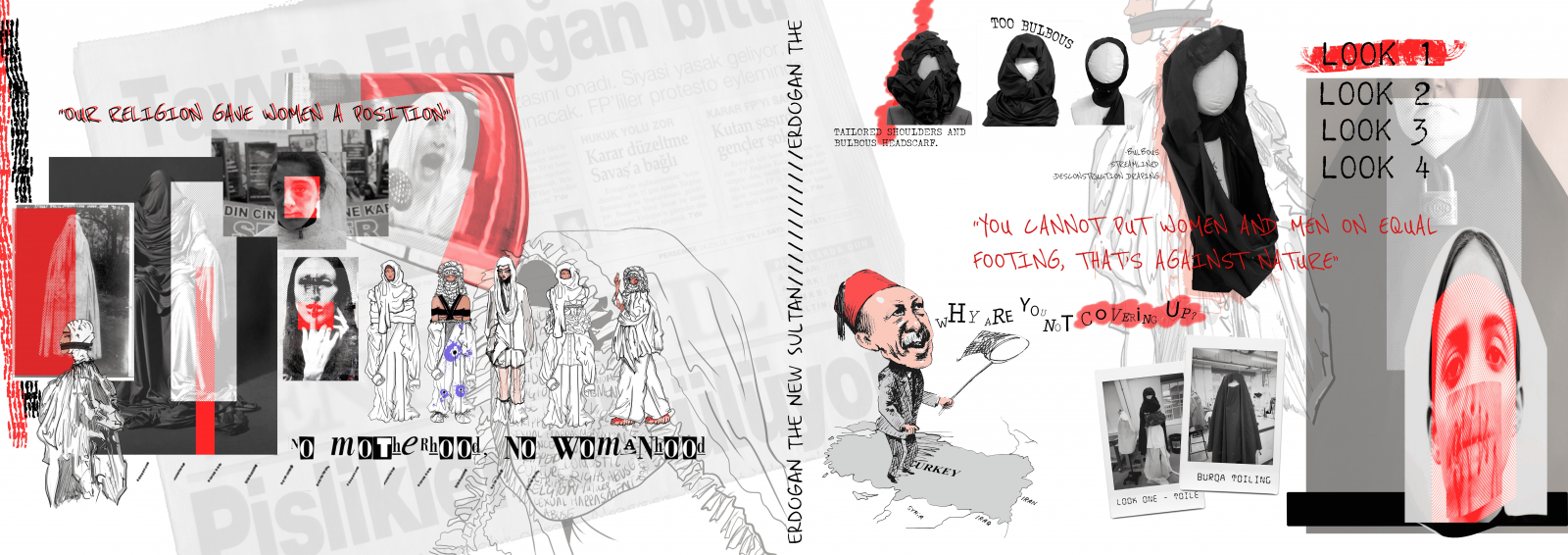 Throughout her project, she was inspired by many strong and powerful women, such as Ataturk’s former wife, Latife Hanim, who played a dominating role and had a sharp sense of fashion for women. Their daughter, Sabiha Gökçen, who was one of the world’s first female pilots, demonstrating authority and independence for women all over Turkey, and then finally by the photographer Shadi Ghadirian, who emphasised in a dramatic work piece, the daily replacement of women’s features with common household goods that dominate them. Women are under immense pressure to meet others’ needs, to the point of losing their own identity. “She is shown behind the window decoration when the curtain is raised”, as a result, she is the person she is.