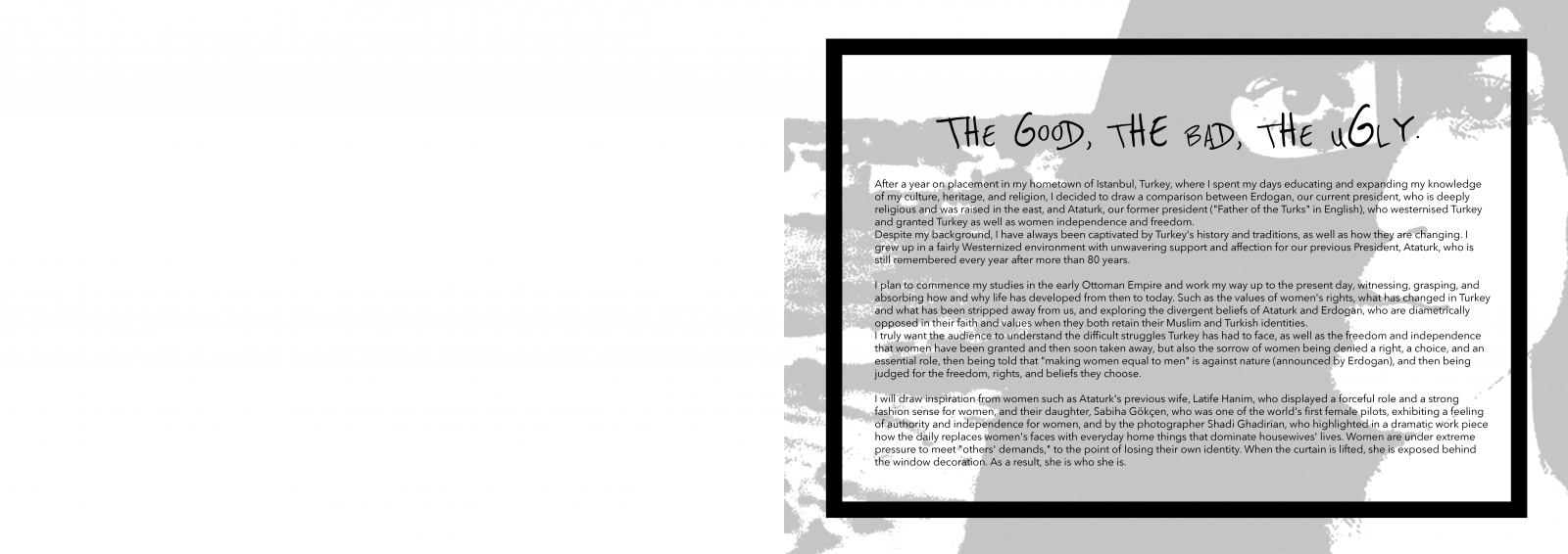 Eliza Gurocak‘s project, The Good, The Bad, The Ugly was inspired by her placement year in her hometown of Turkey. Gurocak spent her COVID-19 year in Turkey working for a textile company, where she spent her days learning and developing her understanding of her culture, history, and religion, as well as the religions of others.
