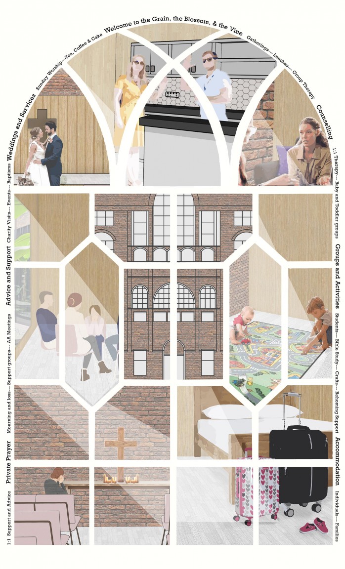 Jodie Burns’s dissertation researched the question ‘What makes a Church’. Her answer: it’s not about the place, it’s about the people. Interesting conclusion to an interior architecture and design piece don’t you think? She found that buildings needed to be designed as ‘a place where church can take place’ because this can be in many more forms than just services.