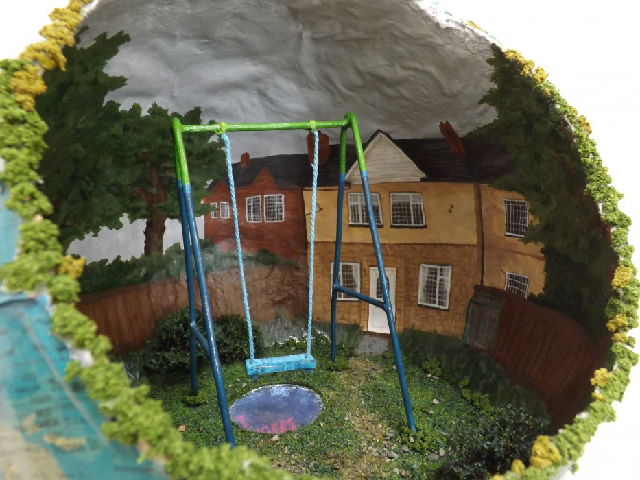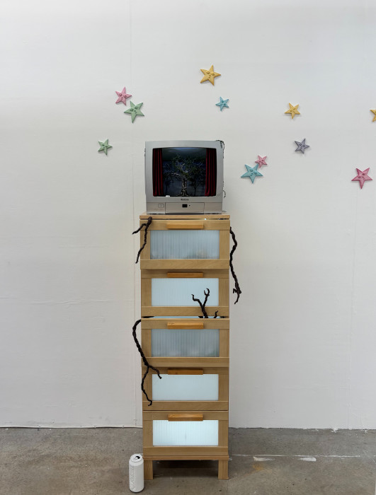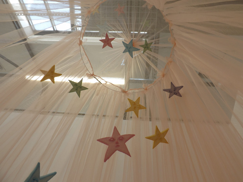 These scenes aim to take the viewer on a journey through the past and have them unpeel the complexities of childhood memories. Gillmore uses sculpture as a medium to reconstruct and reinvent these familiar spaces and objects from childhood; working with clays, casting resins and other materials used in model making and set design to achieve this. The viewer becomes an active participant in the installation, their movement guided by a pathway of hanging resin stars, both welcoming them and acting as silent spectators. Each piece of the installation adds to a distinct narrative of feeling bound by experience which aims to evoke an emotional reaction in the viewer.