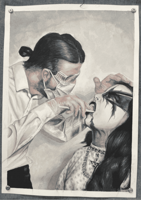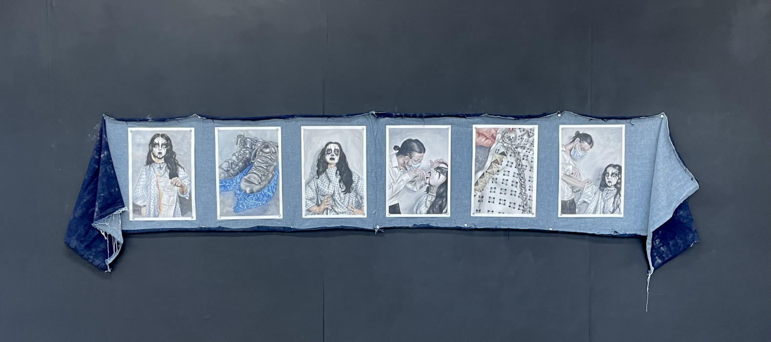 As a painter, Ylenia Lucero has chosen to explore the emotional journey she underwent during her treatment for endometriosis, highlighting the profound impact of not being taken seriously on her mental health. Reflecting on her experiences as both a service user and a healthcare assistant, Lucero delves into the internal conflicts arising from contrasting perspectives. Through her series, she aims to reconcile these contradictions and examine how her identity merges within a clinical environment, reflecting the type of care she desired to receive.