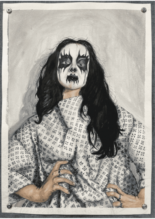 Drawing inspiration from the visual culture of Black Metal music, a genre she is passionate about, Lucero exploits physical attributes such as face paint and common attire, alongside elements from healthcare marketing and PPE. By juxtaposing these influences, she explores the development of a balanced relationship between the two worlds.