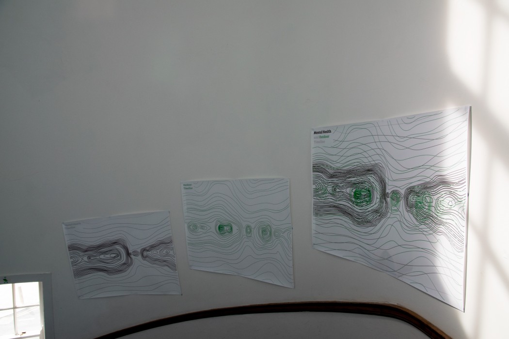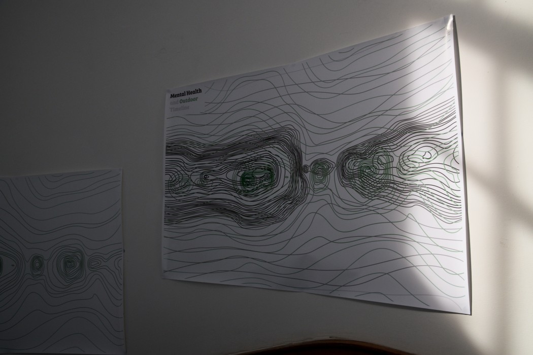 The main focus of Coe’s project was to help demonstrate the important connection between the outdoors and mental health. This is represented by the contour lines shown within the posters. By reading the publication created in this project Coe aims to encourage people that are struggling with their mental health to get out, find what they enjoy, and improve their well-being.