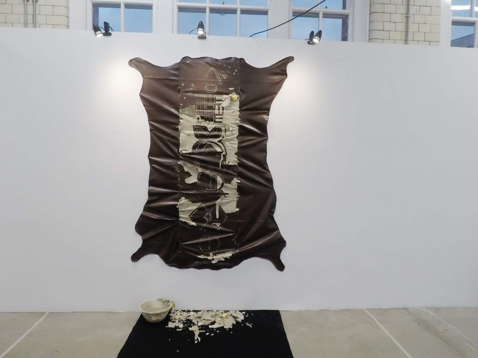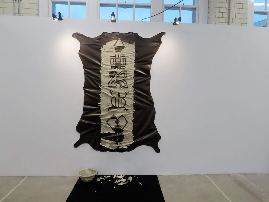 The making is a performative stage where she mixes the clay, forms the symbols, and tidies errant clay. This process is filmed and takes approximately two hours. When the symbols are formed and the clay is wet, the next stage begins. This takes over twenty-four hours to complete, where the clay gradually falls off the canvas unto the black fabric beneath. Stop motion is used to capture this process. As the clay falls off, the symbols are obscured until all the clay falls off and just an imprint is left behind where her fingers left a faint mark as she originally formed the symbols. This is the final stage, and the remnants of the clay can be observed on the ground with gold flakes revealed upon closer inspection.
