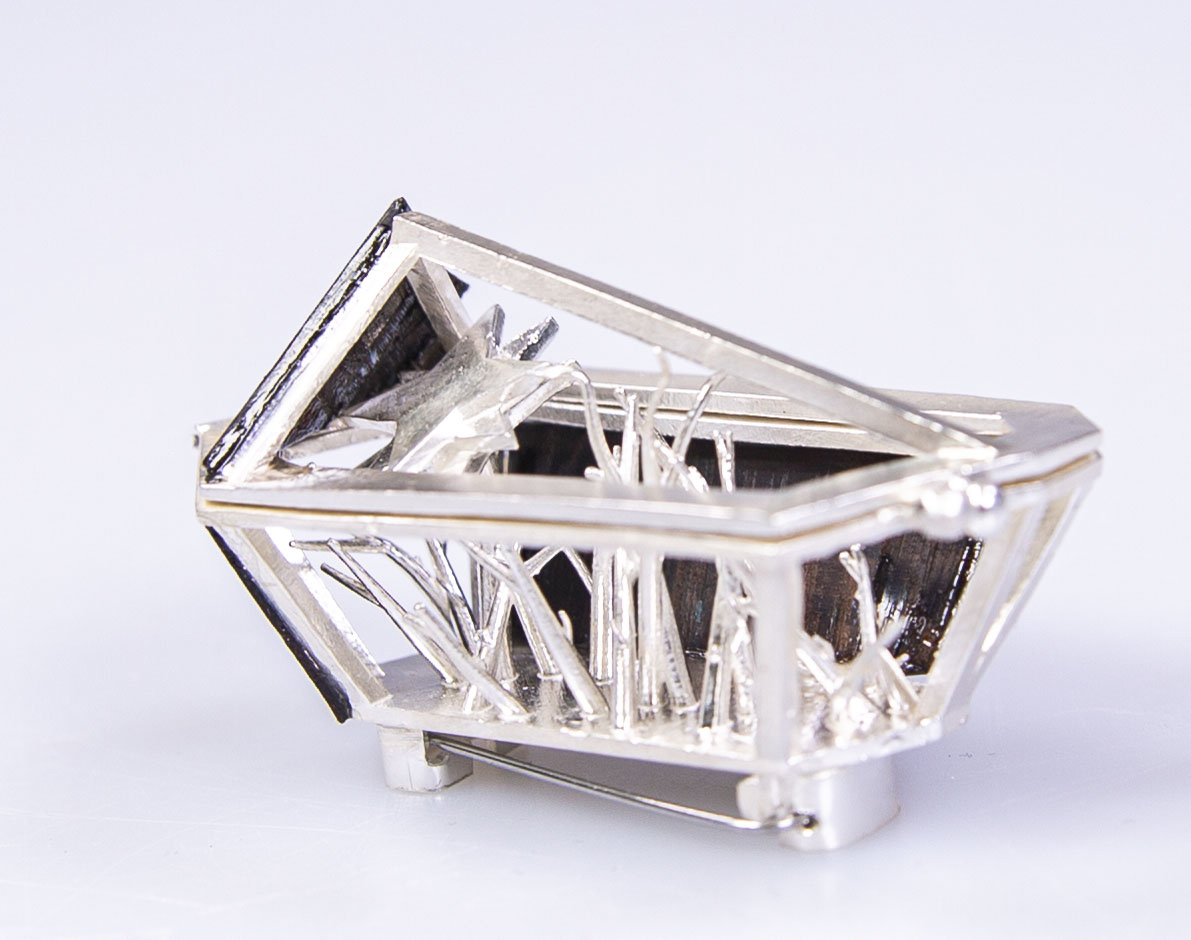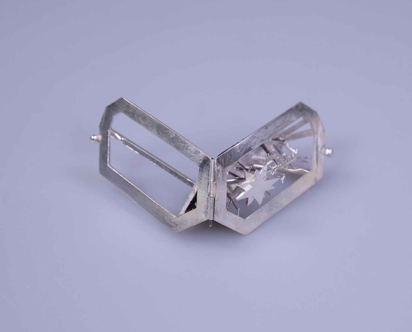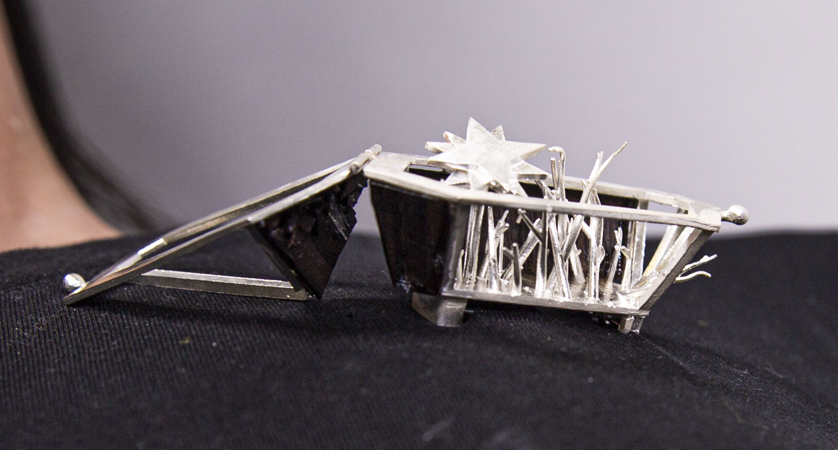 Xiaorui Wang’s complex brooch shows a star representing hope, surrounded by trees like thorns within the heart of a shell with a broken door in which it aims to escape. This represents the hope to live a life of happiness and freedom. She says: