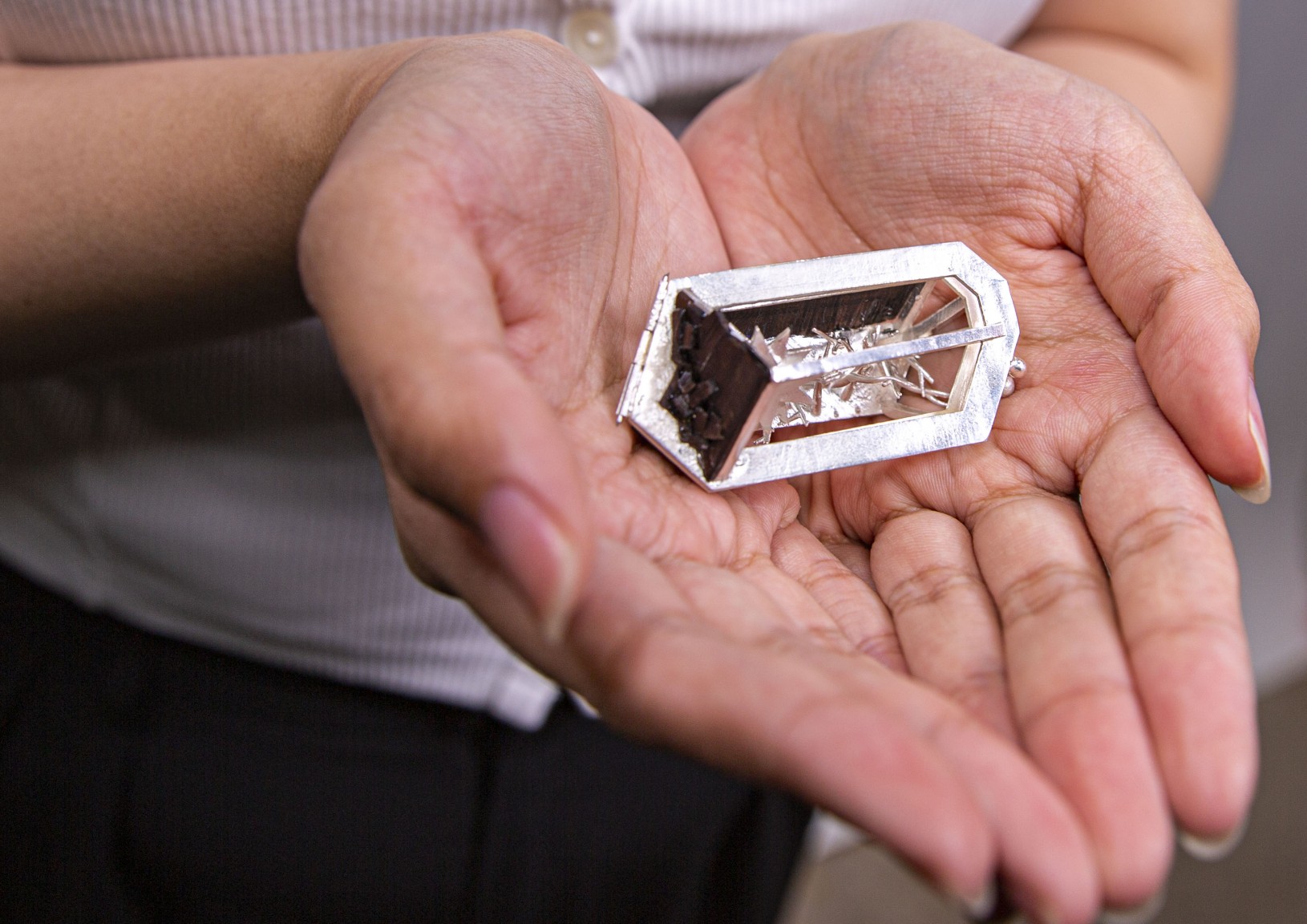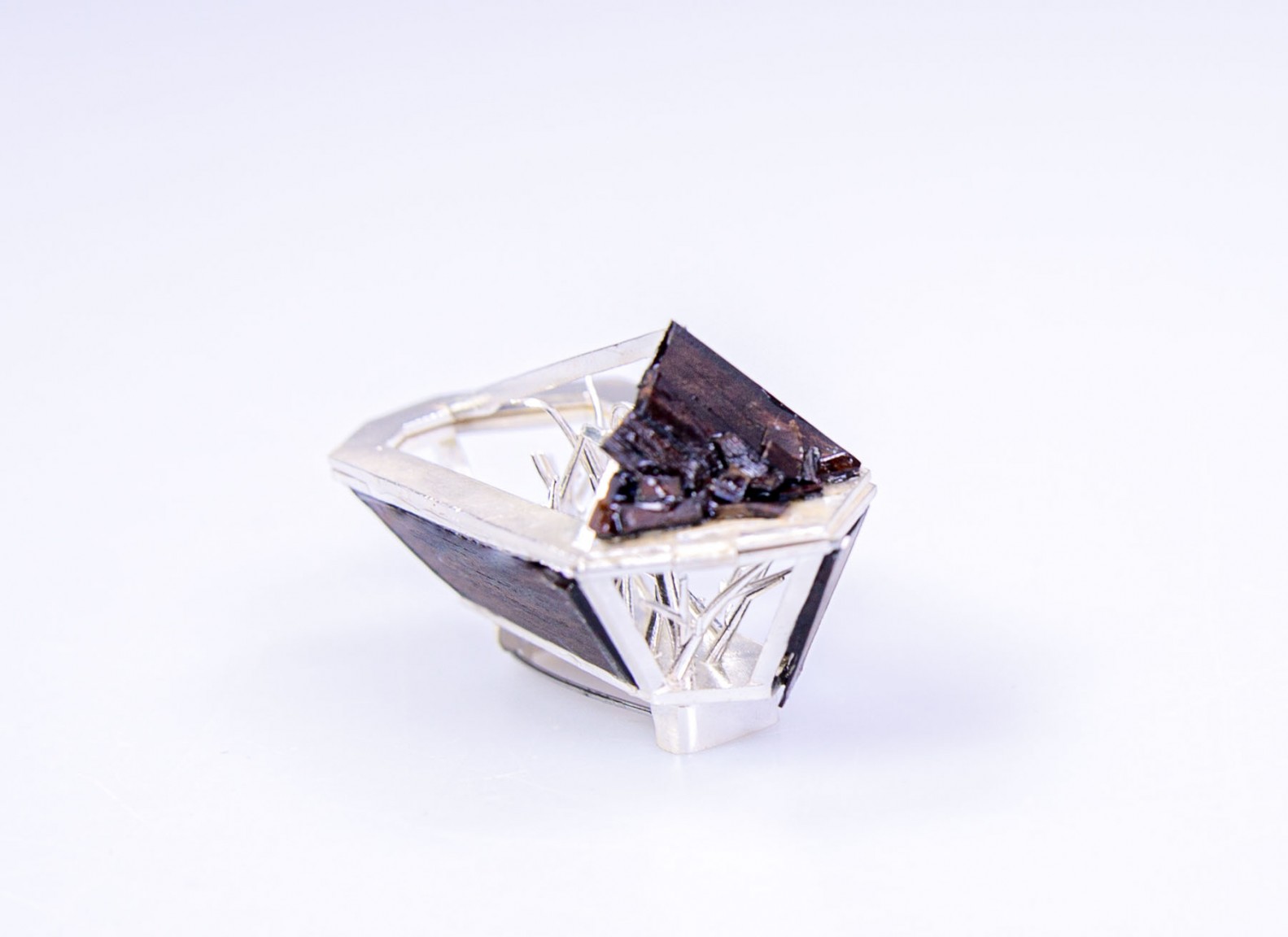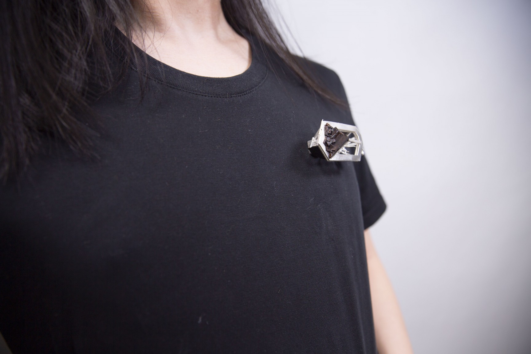 Xiaorui Wang’s complex brooch shows a star representing hope, surrounded by trees like thorns within the heart of a shell with a broken door in which it aims to escape. This represents the hope to live a life of happiness and freedom. She says: