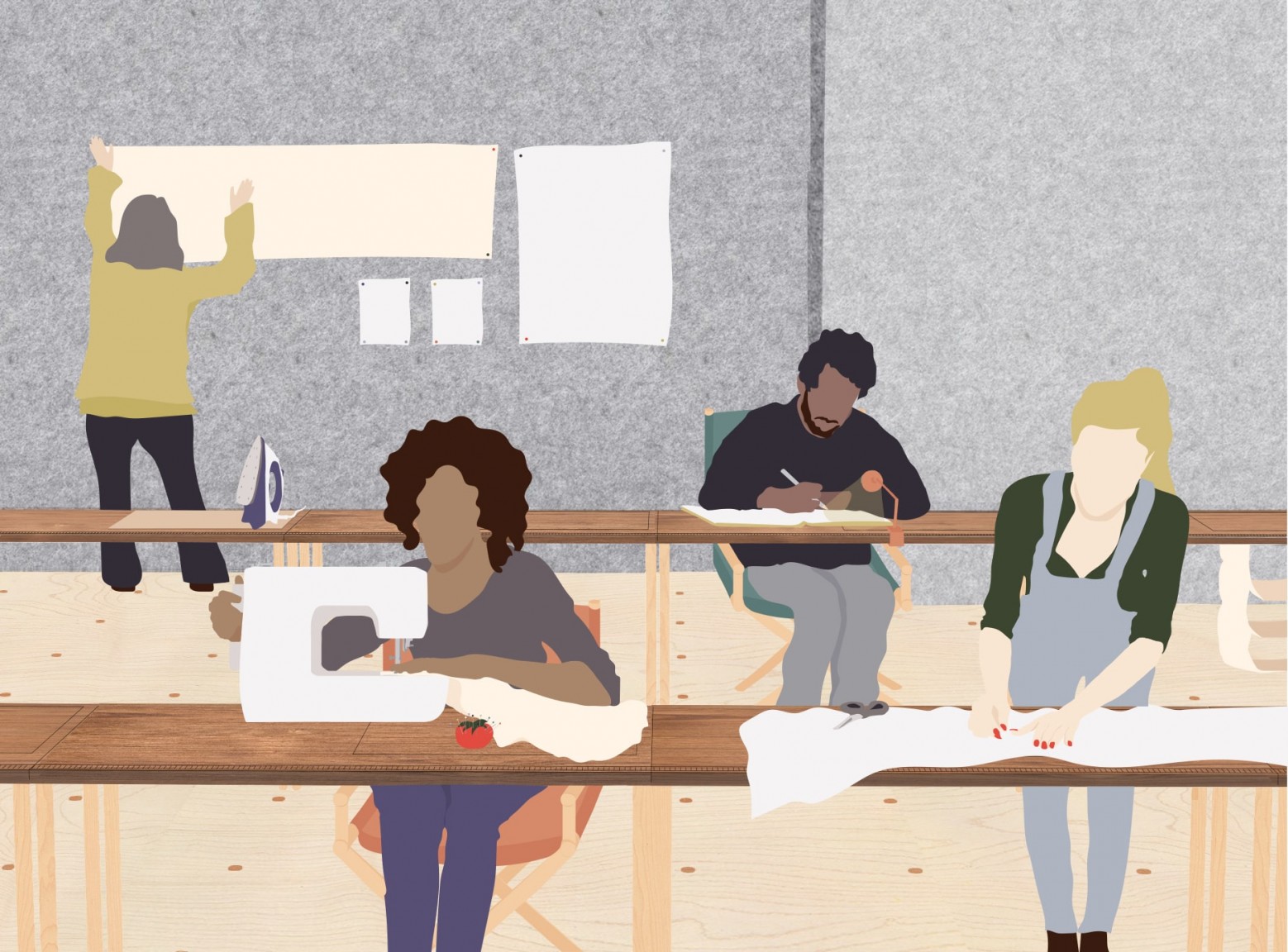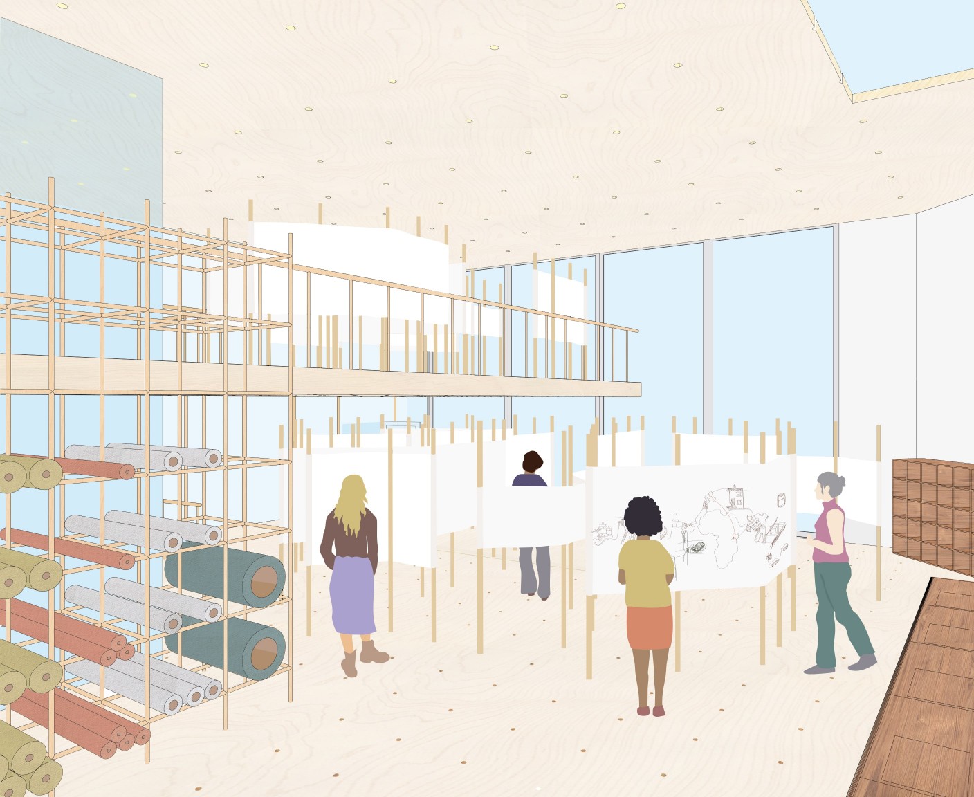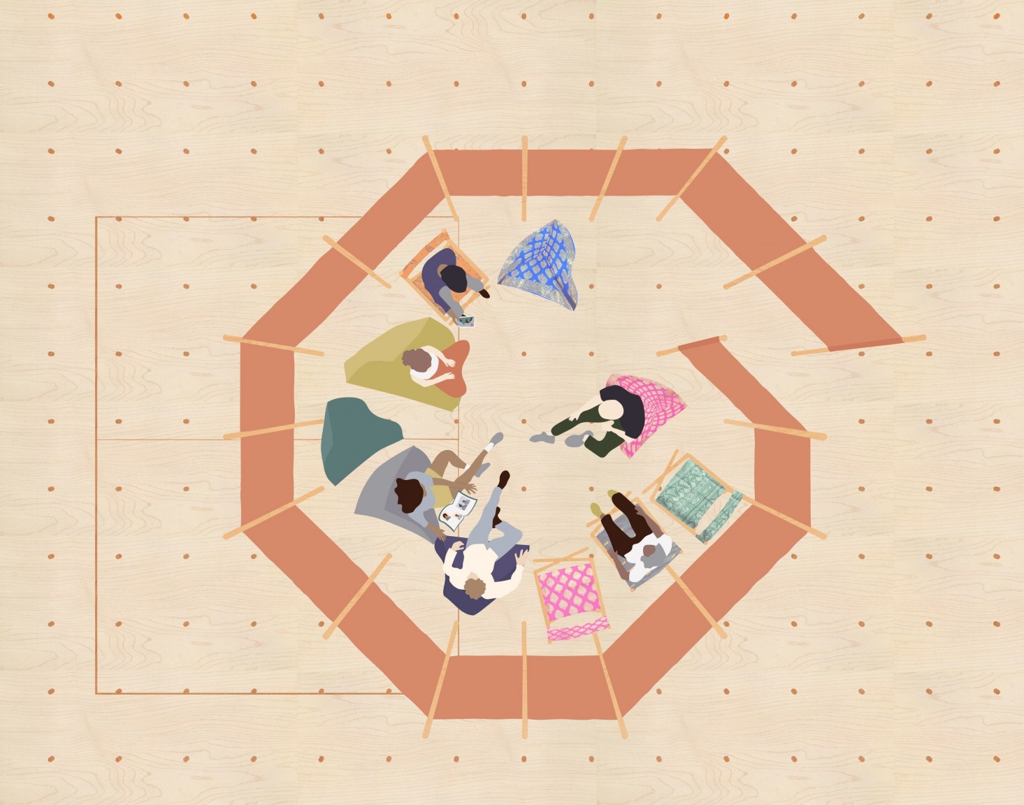 A place where people can go to tell their stories and turn them into tangible artwork to enjoy, exhibit and share is proposed by Chandni Soren in her graduate project, The Sewing Cube. The design’s starting point was her Grandmother’s biography (which formed Soren’s dissertation) a story intertwined with many anecdotes about sewing, a skill which Soren shares. Building on her Grandmother’s memories and stories with images from the family album, stock images and her own unique designs, Soren created the which were refined and embroidered into tapestry. The fixed floor grid Soren proposes is an integral part of this design; the poles engage with it in multiple ways to create storage and different functional spaces. A grid hierarchy of half of a grid (300×300), a fixed grid (600×600) and a double grid (≈1200×1200) are used to create these. There is also a pole hierarchy of 30mm and 60mm diameter used for different functions such as to construct furniture.