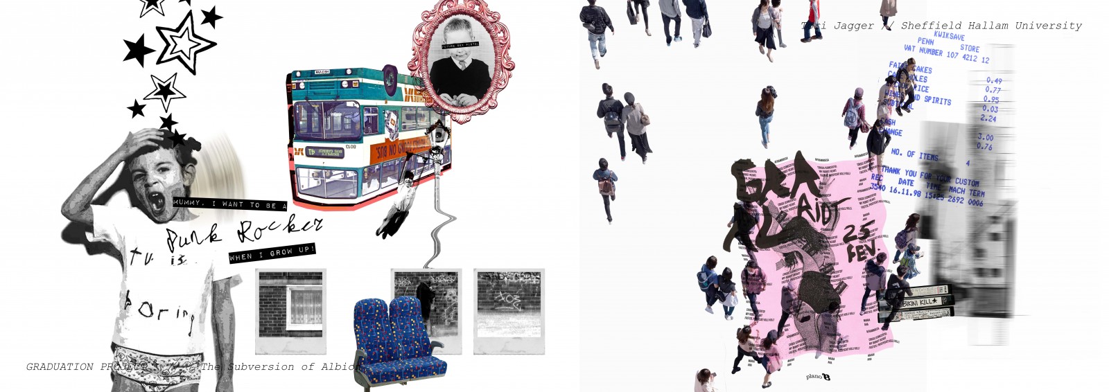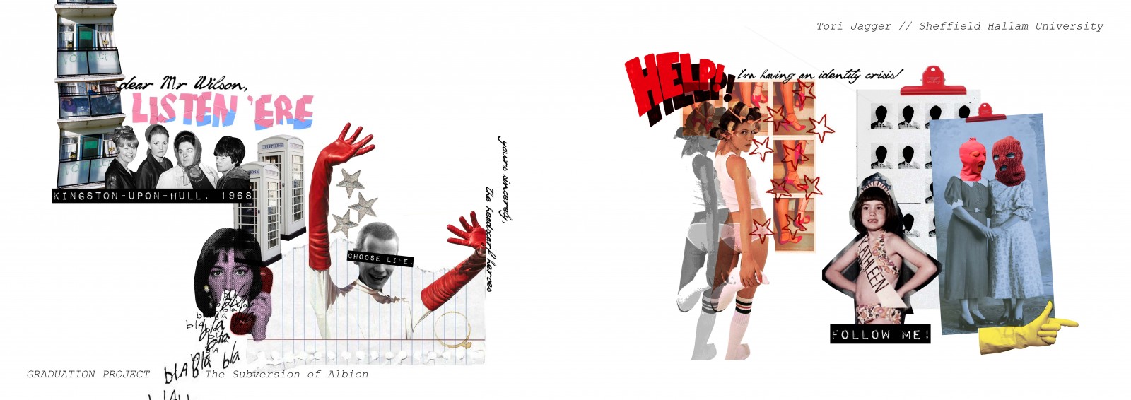 Tori Jagger’s collection brings together different narratives from a history of rebellion and struggle against authority. Through research on feminine artist and working-class cultures, the Subversion of Albion draws upon key silhouettes, shapes and manufacturing finishes. The result is a forward-thinking, clean-cut womenswear collection that expands across multiple categories from structured tailoring and outerwear to delicate drapery. Supporting research includes various resources and mediums, such as primary and secondary imagery, text and photography. Jagger used her conceptual research to develop ideas and designs and can be seen in her final collection.