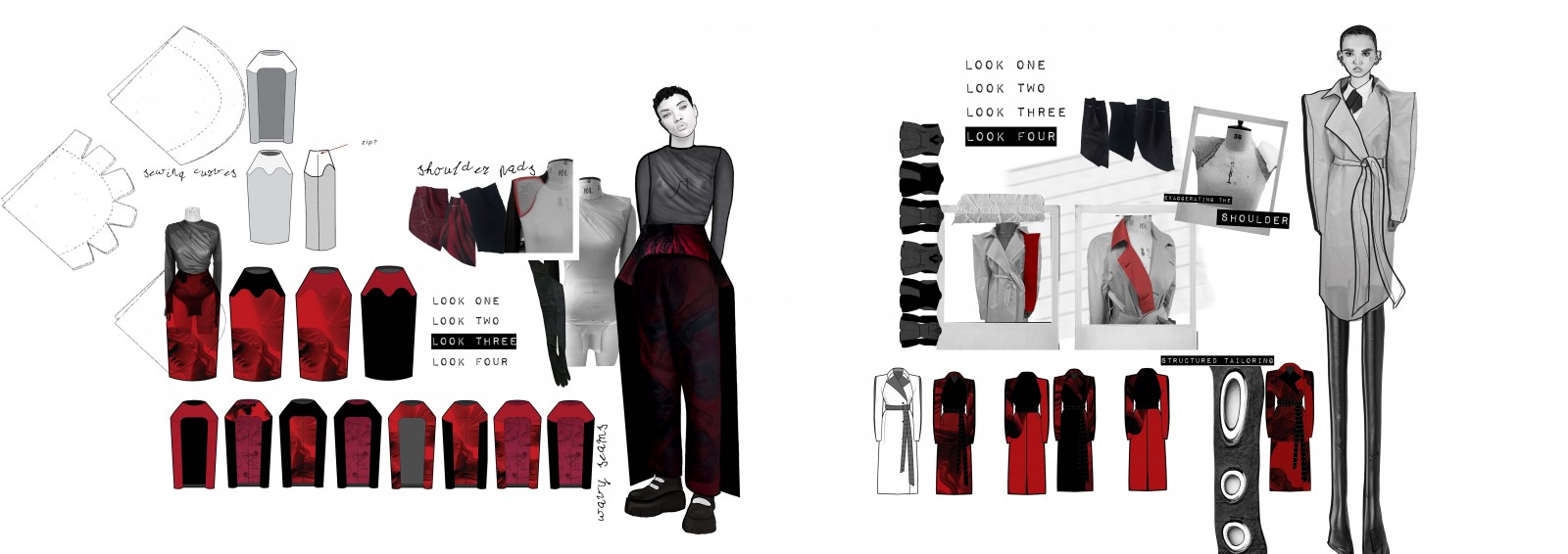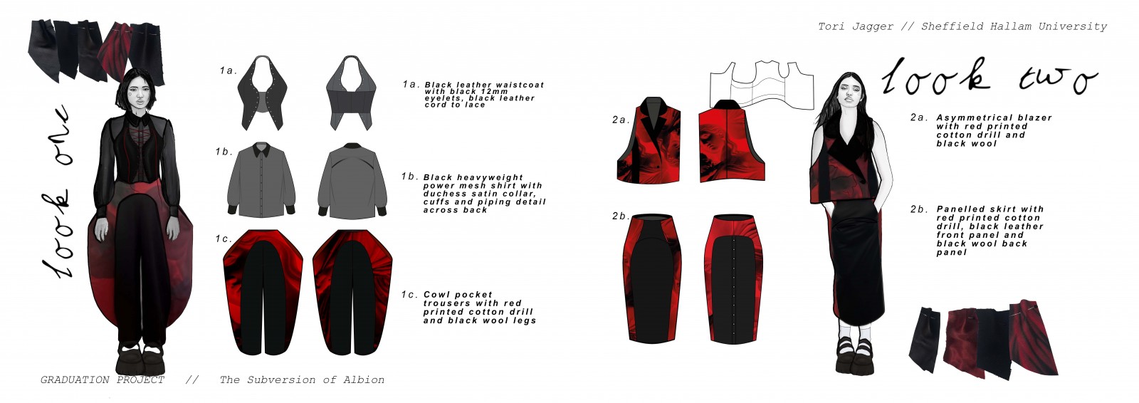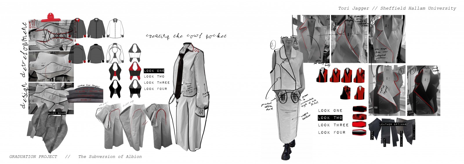 The Subversion of Albion is an autumn/winter collection featuring elements of structured outerwear, clean tailoring and soft drapery. The core four looks encapsulate Jagger’s research, design work and technical toiling processes. Supporting these are technical packs, plentiful illustrations, fabric swatches and technical samples.