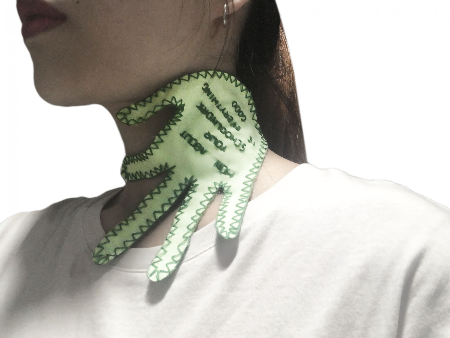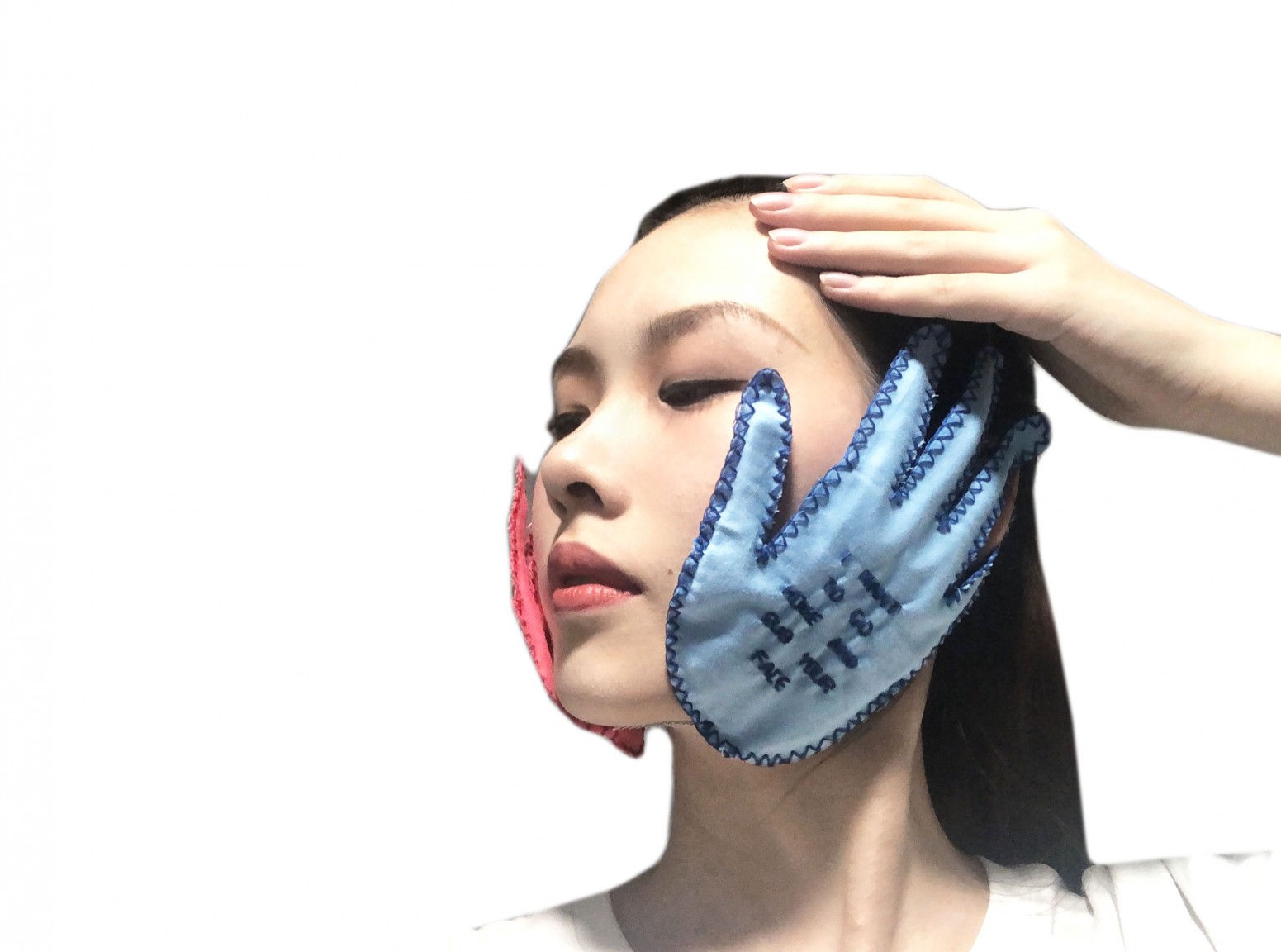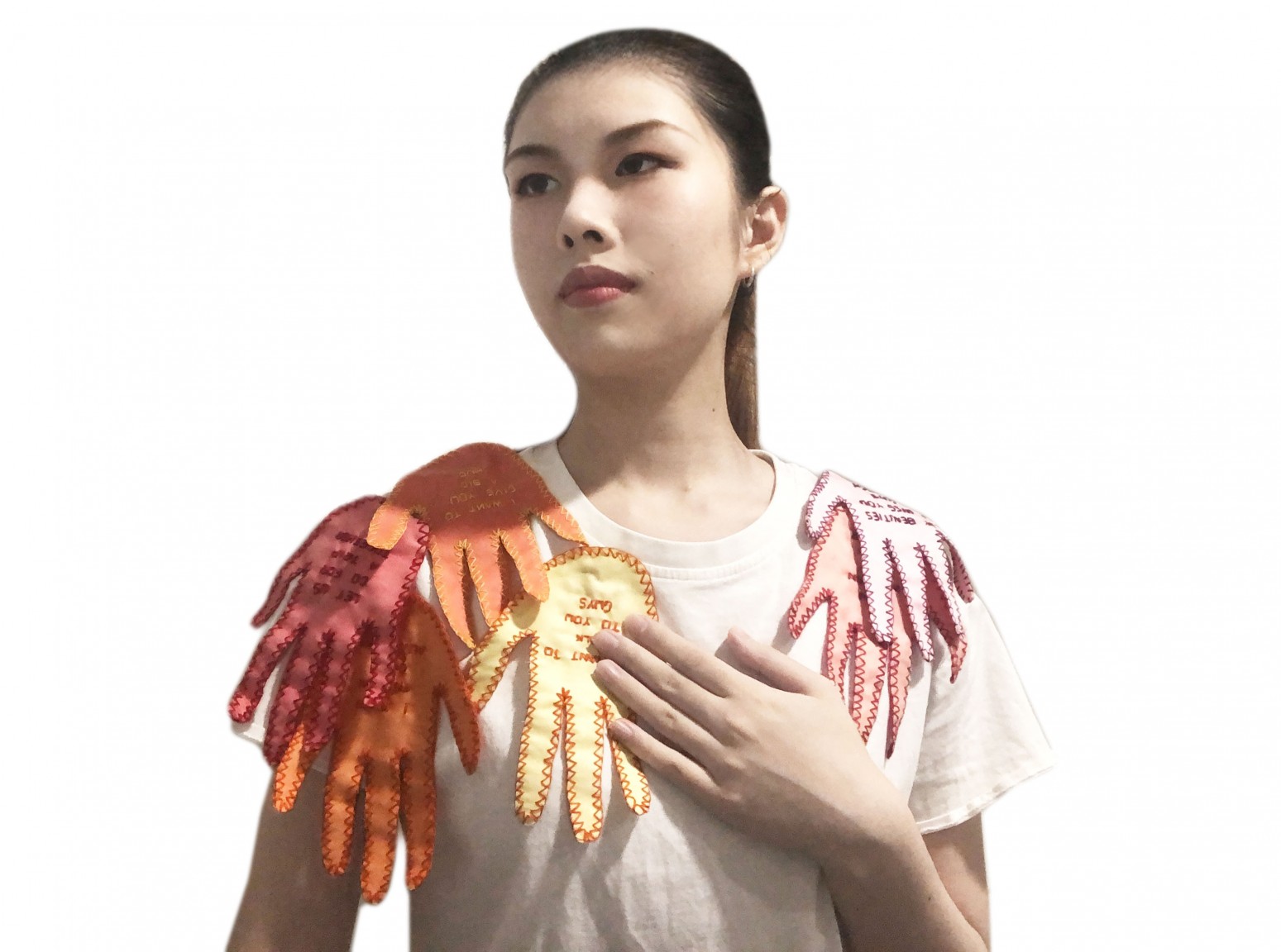 “I decided to collect different hand shapes from different people in order to compare the differences between every hand. According to the shape, colour hand the details of joints, the relationship between occupations and the features of hands is also could be recognized. The hands’ positions – group hugs or more intimate cuddles are different, allowing people to recognise differing emotions represented by wearing place, number of hands and materials. Above all, when the wears put on these “hands” which represent the wishes and physical touching from the families and friends, it feels like they are all around.”