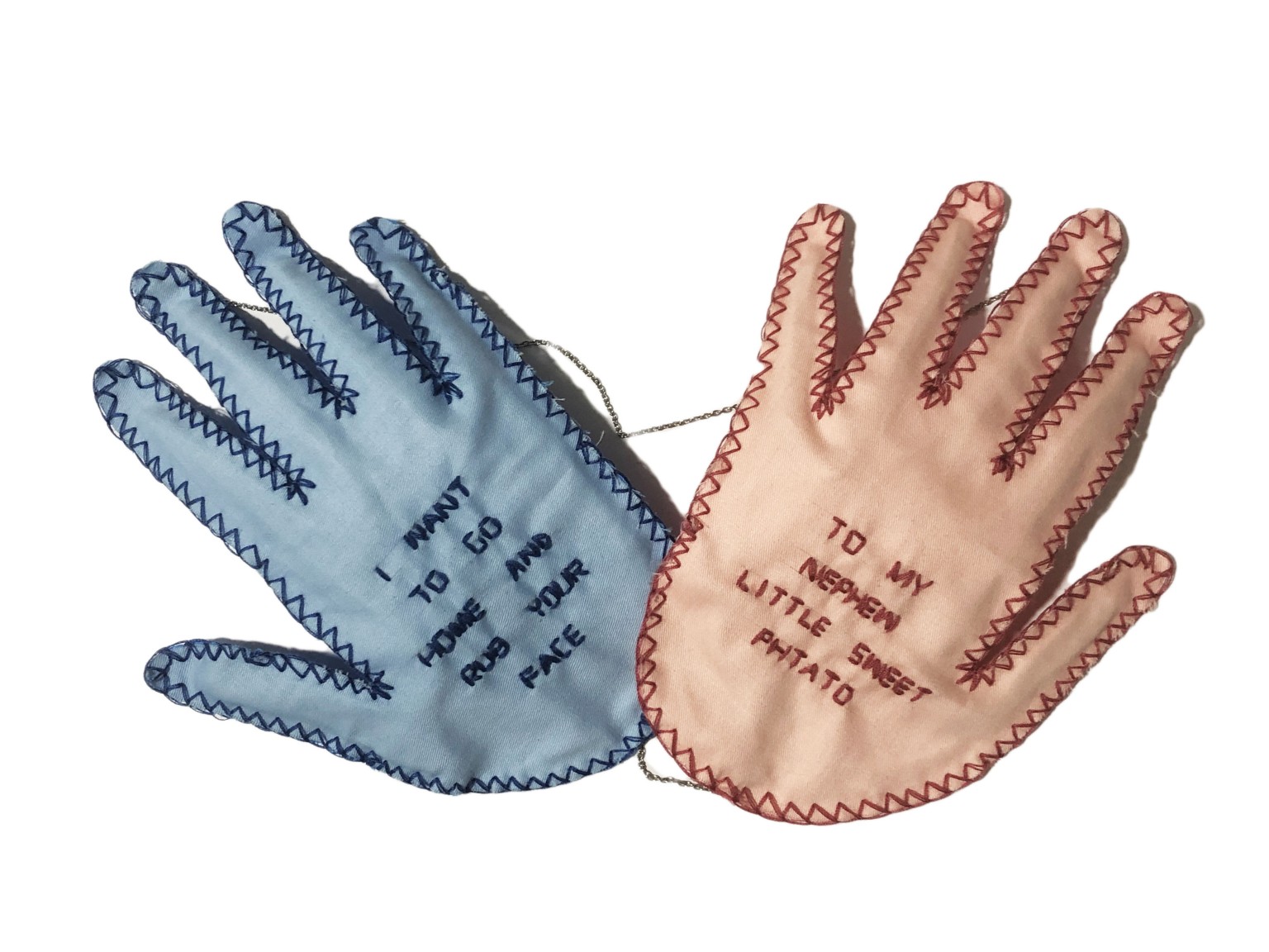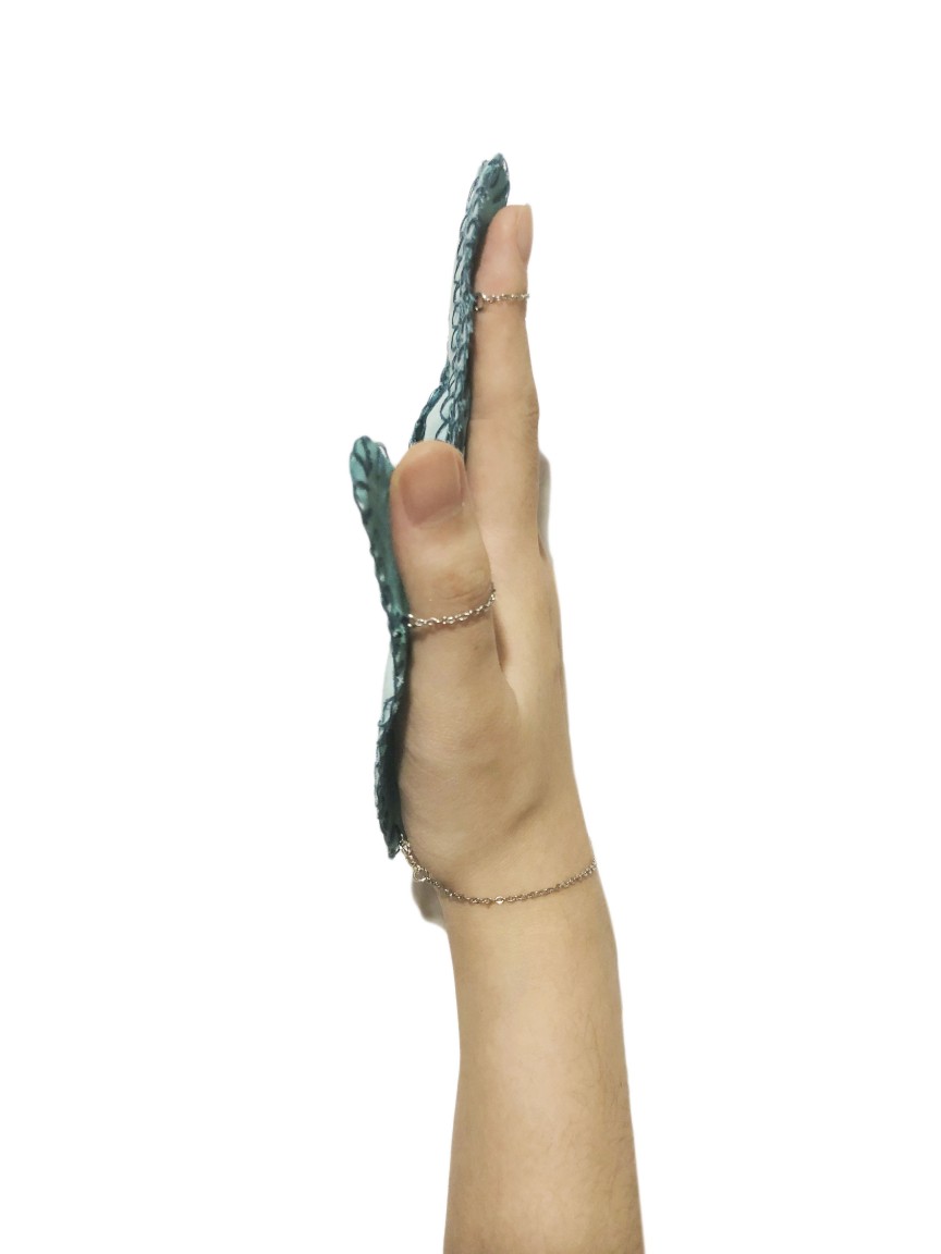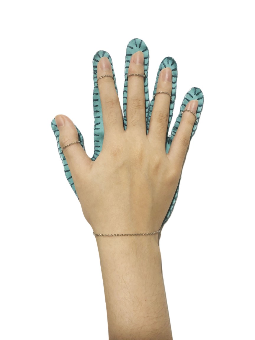 “I decided to collect different hand shapes from different people in order to compare the differences between every hand. According to the shape, colour hand the details of joints, the relationship between occupations and the features of hands is also could be recognized. The hands’ positions – group hugs or more intimate cuddles are different, allowing people to recognise differing emotions represented by wearing place, number of hands and materials. Above all, when the wears put on these “hands” which represent the wishes and physical touching from the families and friends, it feels like they are all around.”