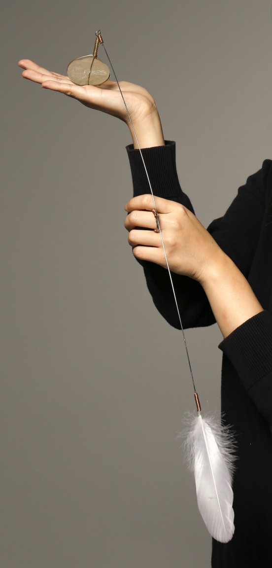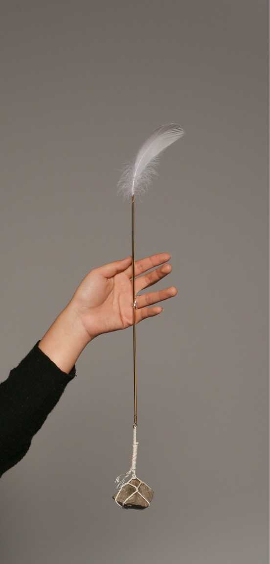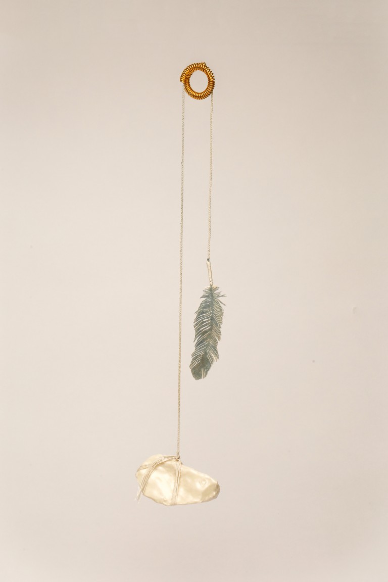 Ma’s works are presented in four different elements, made using various different materials such as resin, ceramic and plated metals. Using materials such as feathers and stones to represent the imbalance, Ma lets gravity do the work of symbolising power.