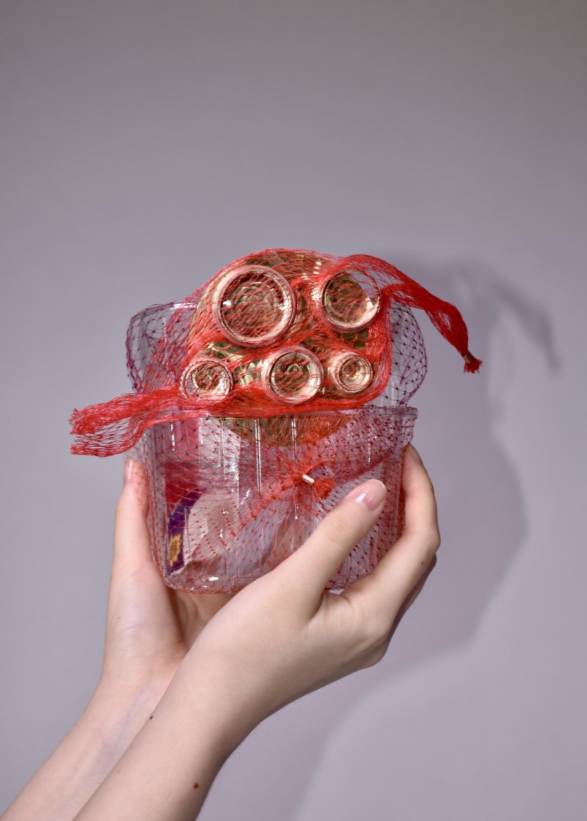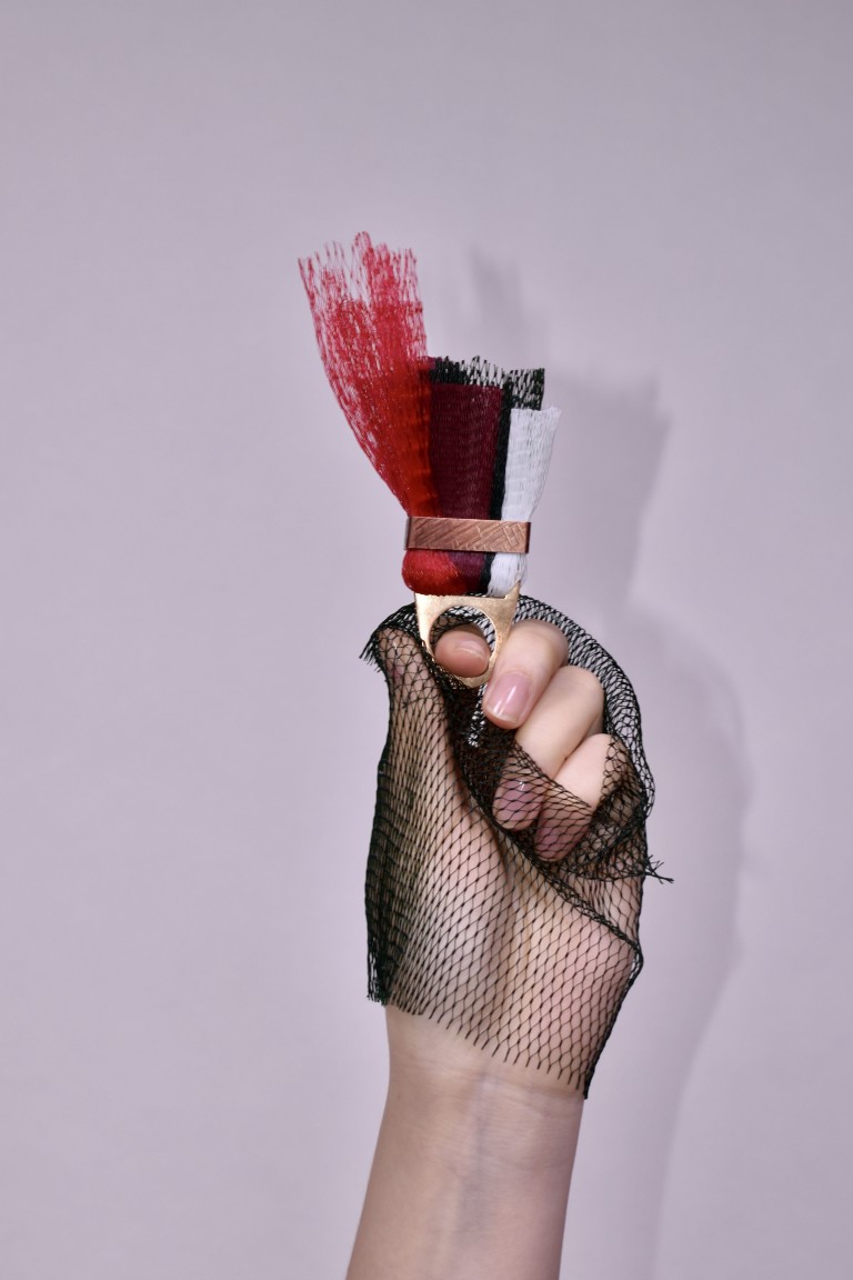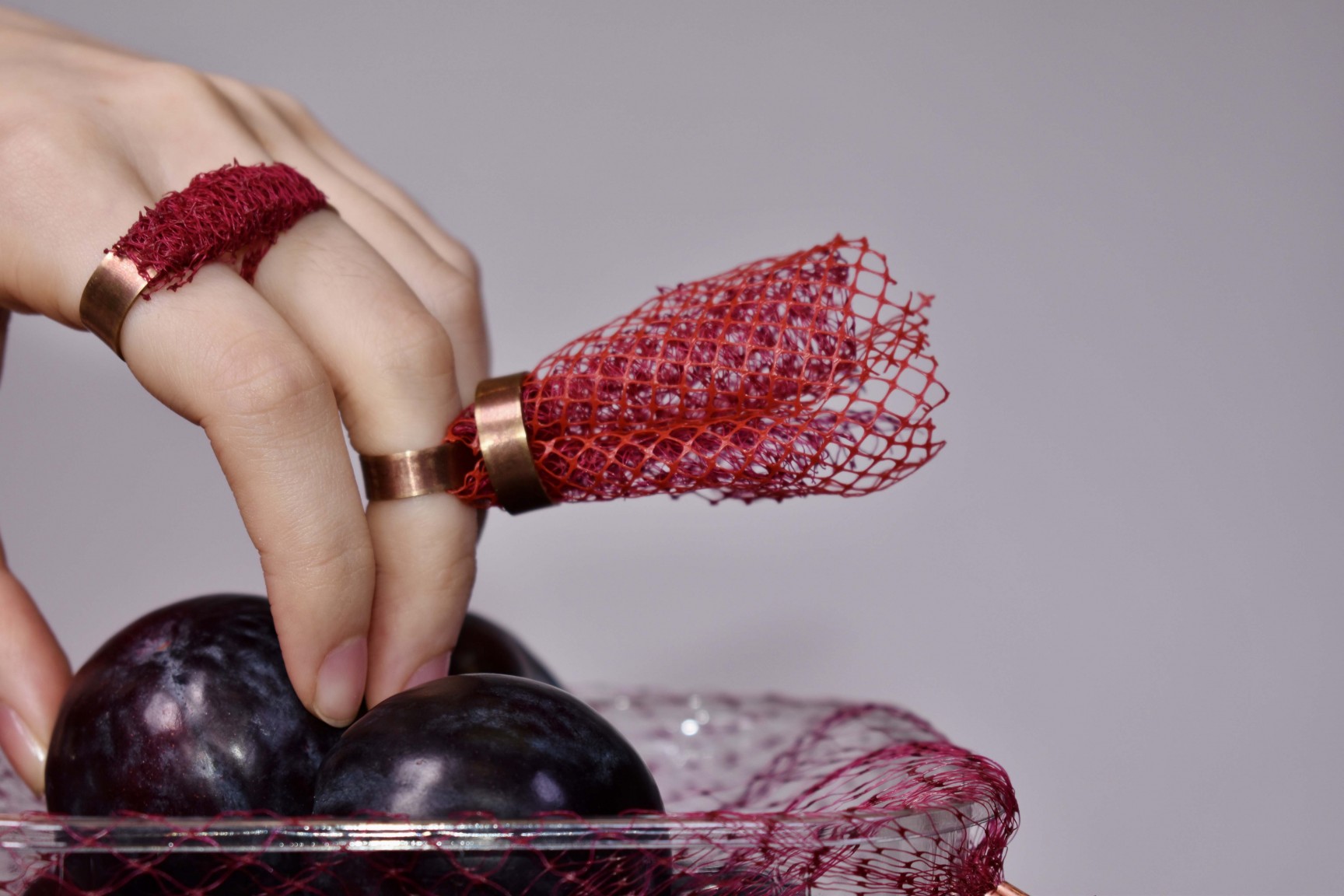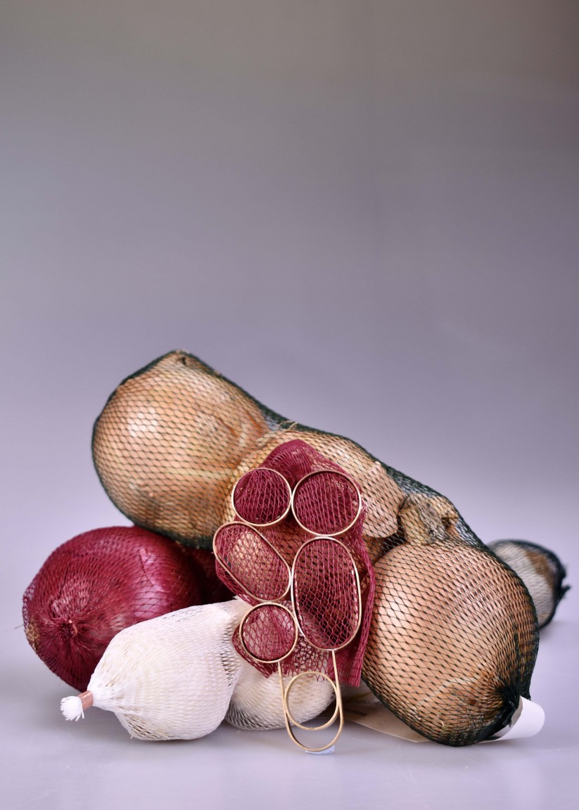 Using materials derived from supermarket food bags Ying creates works of recycled, reused and repurposed waste with a distinctive voice which transcends their physical form. In doing so, Ying explores the perceived value of combining man-made materials with wearable jewellery, raising awareness of synthetic materials and their potential. whilst offering a pathway to reduce plastic waste.