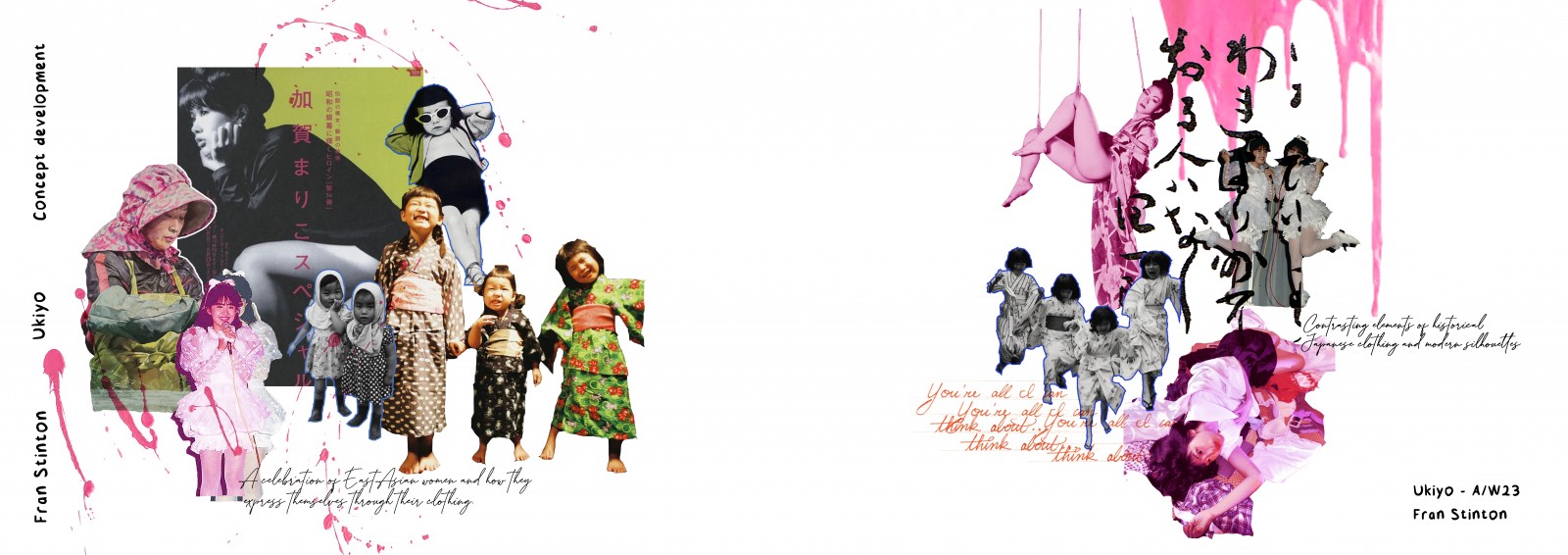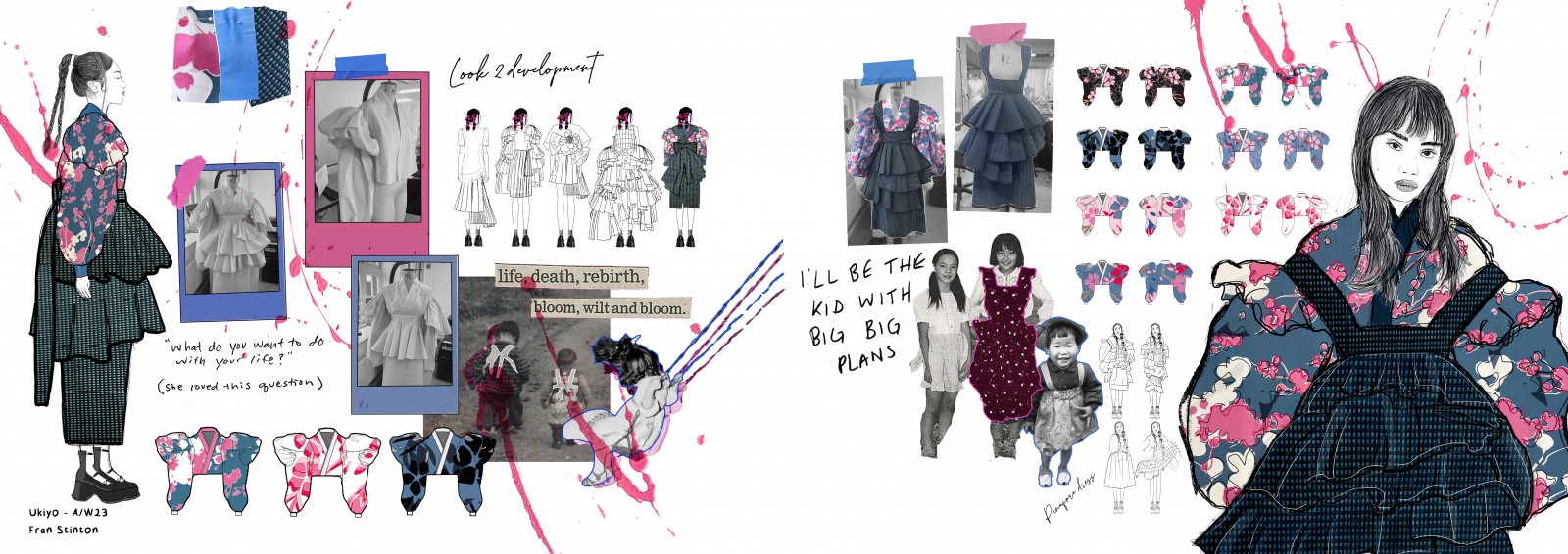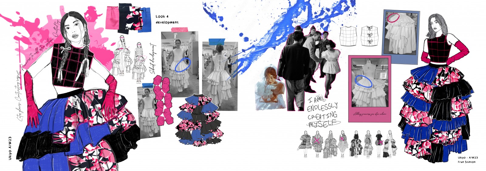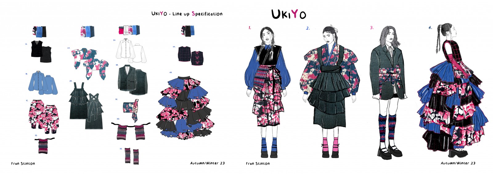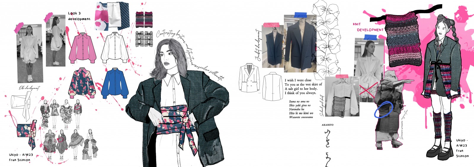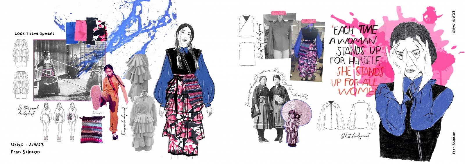 For her final project, Fran Stinton took inspiration from women in Japanese society. Exploring the timeline of a woman’s life and taking inspiration from the types of clothing worn throughout childhood, transitioning into adolescence and eventually adulthood. During her research she discovered that many Japanese women throughout history have campaigned for independence and have fought against traditional female stereotypes such as pressures to get married and have children rather than exploring their own desires and aspirations. Fran also took inspiration from the armour and protective clothing worn by female samurai warriors in pre-modern Japan.
