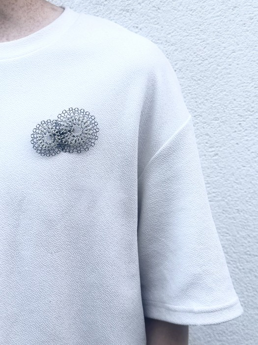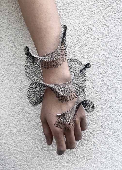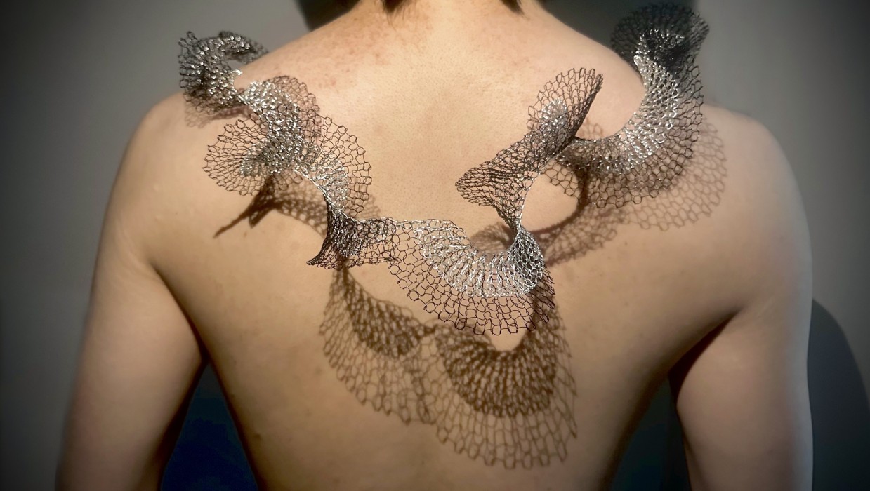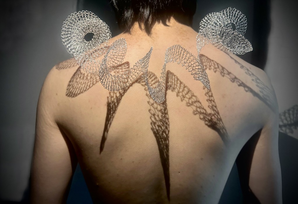 Leungching Ma’s jewellery explores the connection between body, shadow, and object. Jewellery, as wearable artworks, is usually physical, but but in Ma’s work the shadows the jewellery cast when worn are also part of the artwork. Ma also uses different coloured metal wires to distinguish between shadows and objects, contrasting the touchable and untouchable.