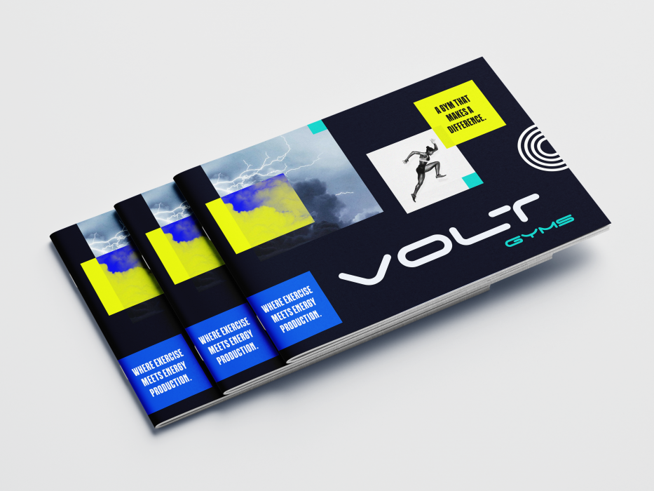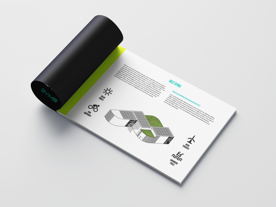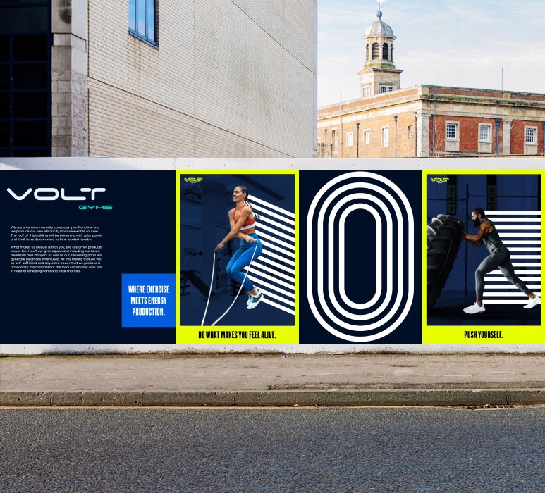 Yasmin Redman has designed an eco-conscious gym franchise concept from scratch, called ‘Volt Gyms’.  As well as utilising solar power and wind power, the gym equipment – including the bikes, treadmills and steppers, as well as the swimming pools – generate electricity when used. All this means that the gyms would be self-sufficient and any extra power that is produced would be provided to the members of the local community who are in need of a helping hand, and local charities. The swimming pools within the gyms would capture every ounce of power by utilising cutting-edge miniature wave power generators. So, while people splash around, or swim a length, all that motion is translated into electric power. Yasmin has designed posters and a brochure advertising the gyms, the exterior and interior of one building, a website and merchandise.
