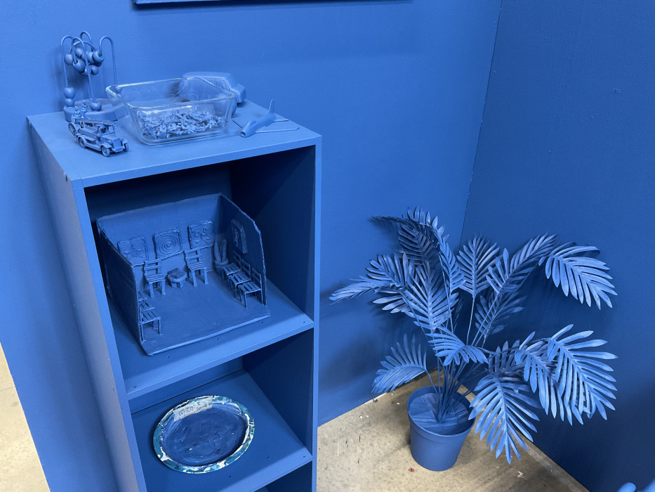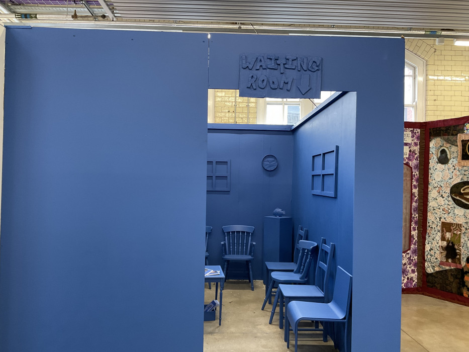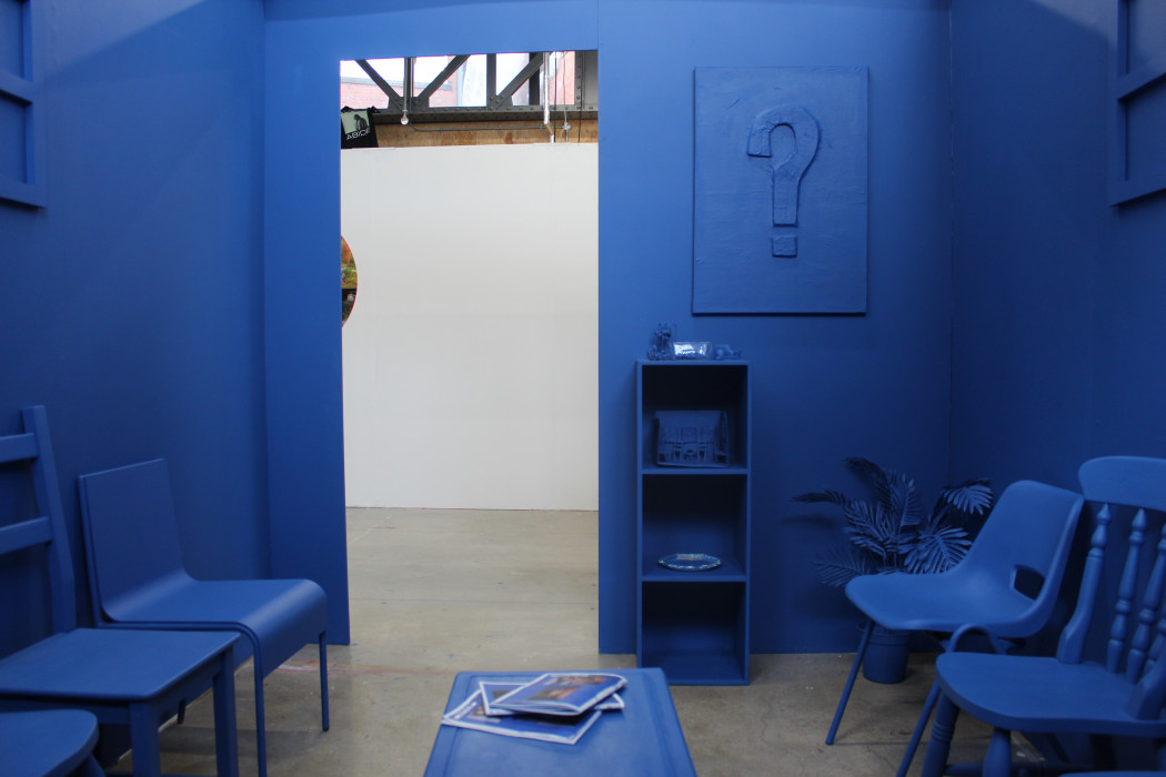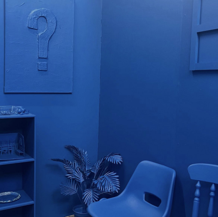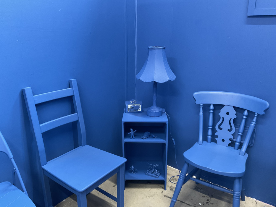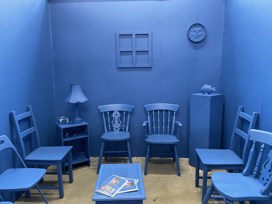 Blue Dunnington-Booth invites you to wait with them, wait for them, wait here for a while. Waiting Room in ‘BLUE’s bLUE’ is a fully immersive and interactive installation of a to-scale waiting room showcasing ‘BLUE’s bLUE’, a new shade of blue found by Blue (the person, the bluest blue), this installation allows the audience to sit fully immersed in ‘BLUE’s bLUE’ and feel the discomfort of their first voluntary waiting experience. Waiting as a practice, is never voluntary and this work is a demonstration of the purgatory Blue sat in for so long and fought so hard to escape. This a self portrait, a baring of self to an audience in a vulnerable way a true depiction of Blue’s mind and soul. Blue Dunnington-Booth is ‘BLUE’s bLUE’ and ‘BLUE’s bLUE’ is Blue Dunnington-Booth.