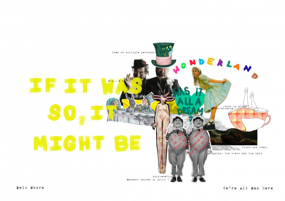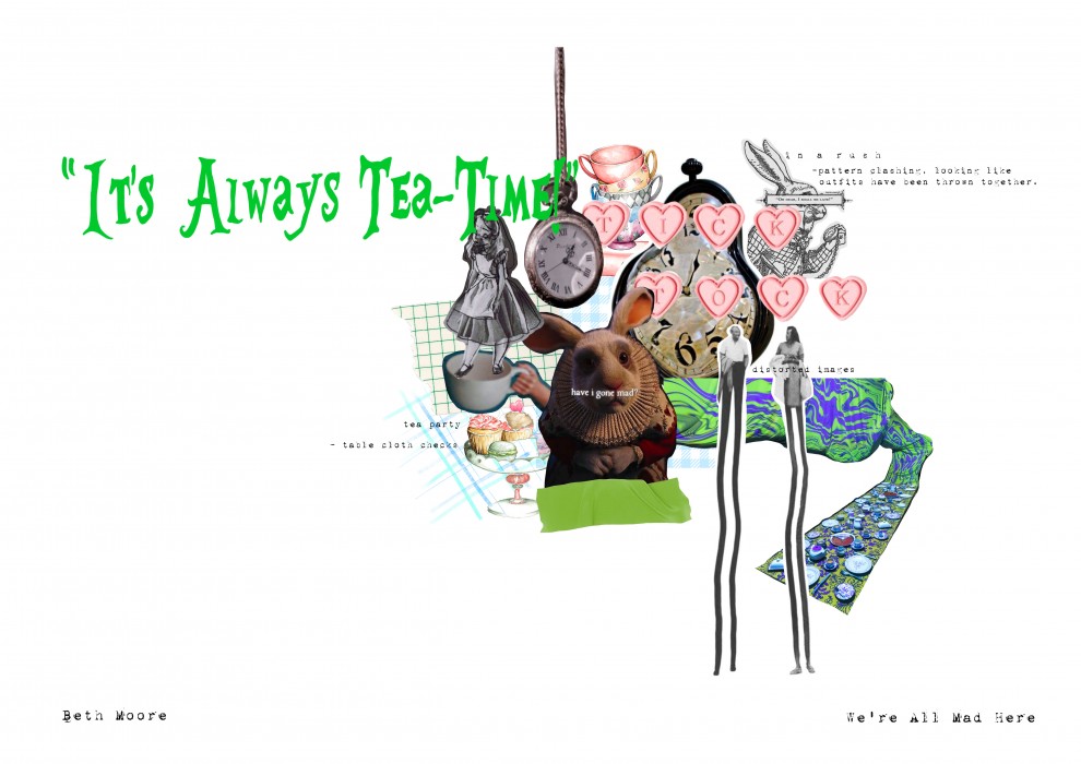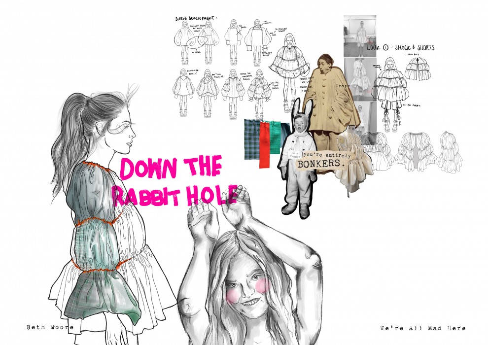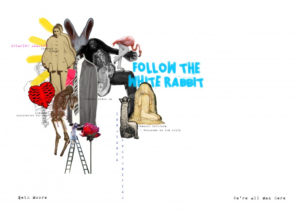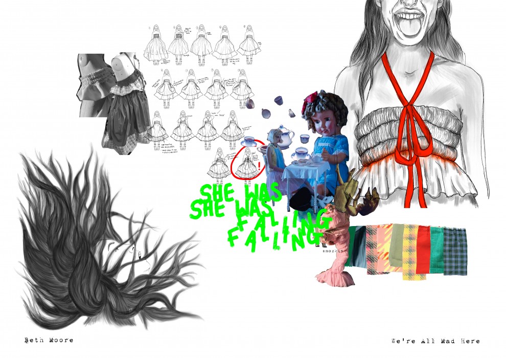 “We’re All Mad Here” is a graduate collection by Beth Moore, inspired by a child’s curious struggle to understand the confusing world of an adult, specifically focusing on the escapism of everyday life, as seen in Lewis Carroll’s Adventures in Wonderland. With a focus on the themes of fantasy that are presented both within the novels and the movies, Moore presents a collection that is full of creativity and imagination. Further themes of childhood innocence and escapism are explored, as well as coming of age is inspired by Alice as she attempts to manage inner conflicts, such as her identity.