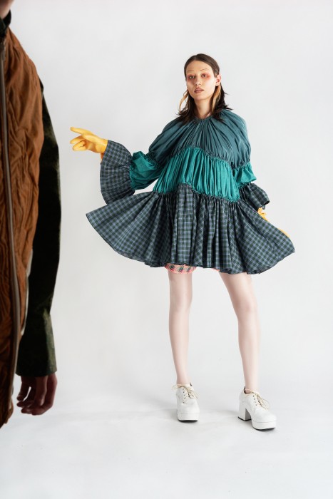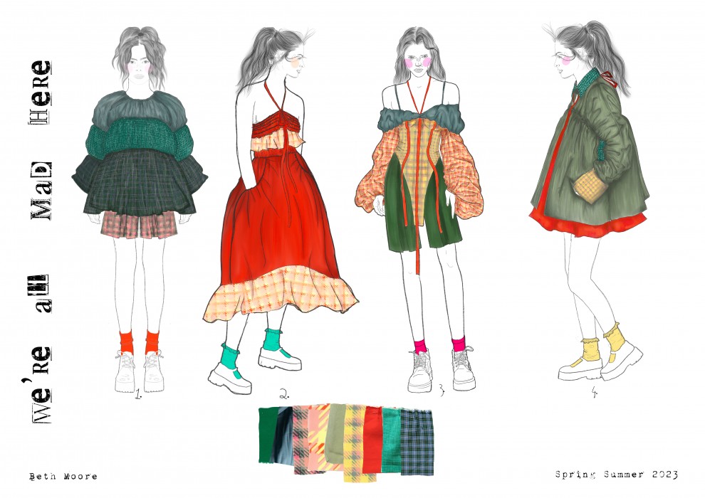 In order to keep her work childlike, Moore explored the idea of playing dress up. In order to do this, print clashing has been used as a main feature, almost as though the garments have been thrown on in a rush.