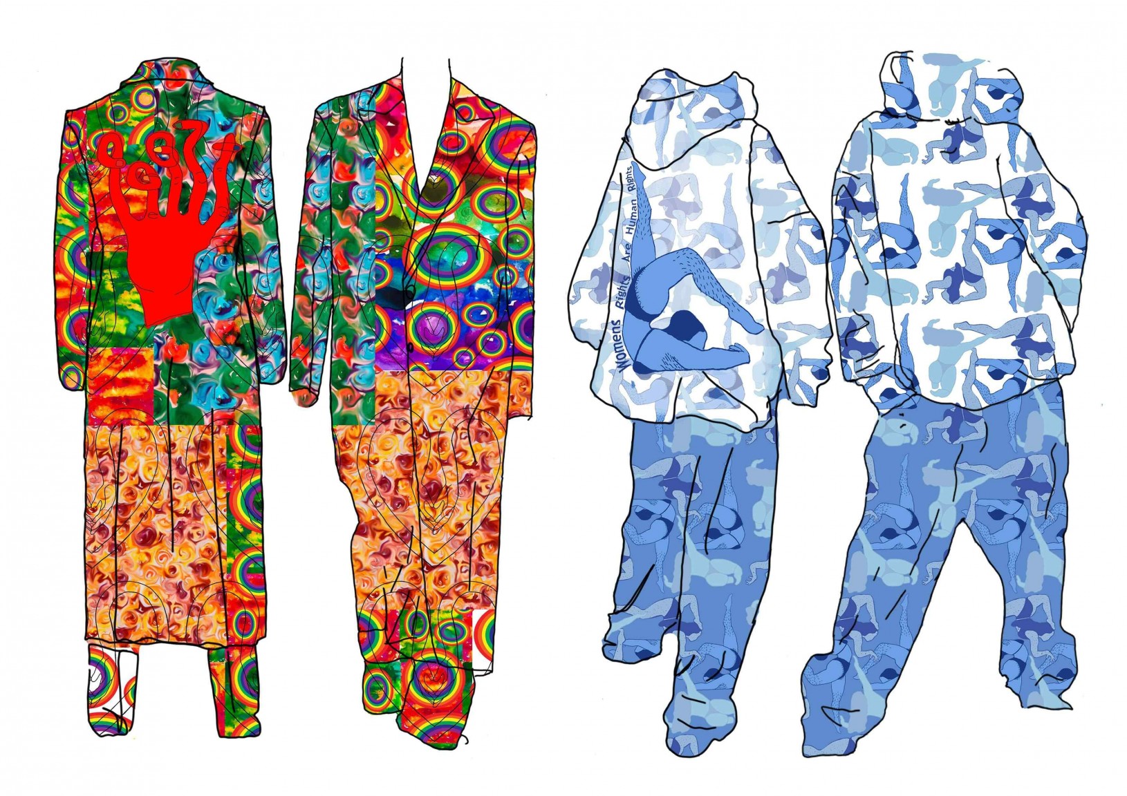 In Fashion Activism, Coney uses fashion to advocate for sustainability, the LGBTQ+ Community and women’s rights. She produced fun and colourful designs, inspired by TV drama It’s a Sin. This show is based during the eighties, at the height of the Aids pandemic. The garment designs are influenced by 80’s fashion and the current loungewear trend of Covid-19. Coney also uses block-coloured patchwork patterns to show the diversity of powerful women.