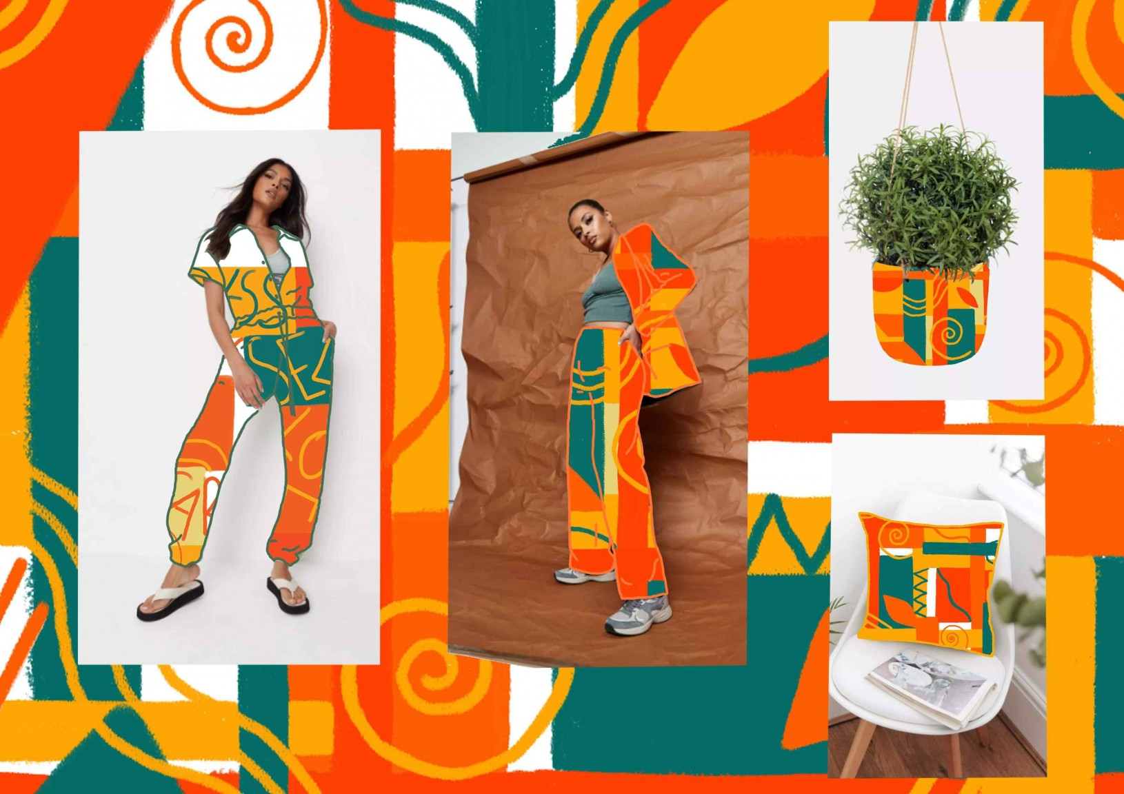 Coney’s Patterns of Behaviour is a design for end papers for a Penguin biography of Alan Bennett, influenced by Bennetts’ ‘old soul’ and his roots within theatre and TV. Coney also created fun designs for Missguided, and their Joyful Expression 2021 collection. She played with colour and shape in this work, inspired by the ’raw and naïve’ artistic perspective of children.