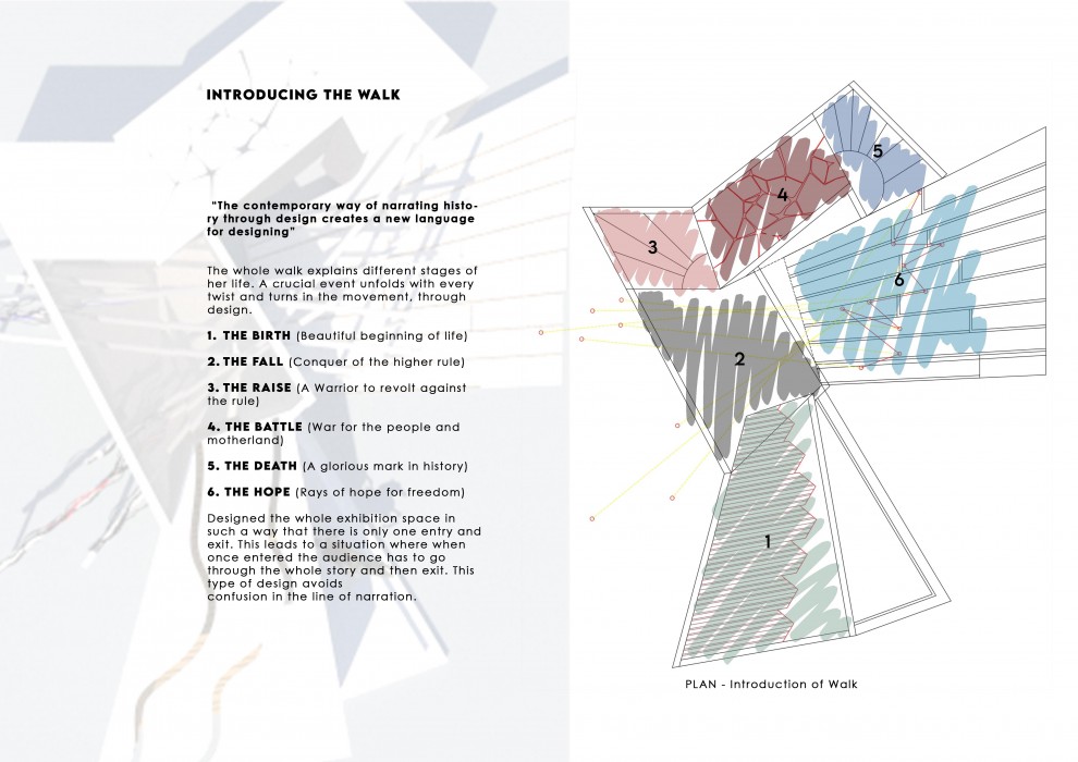 The storytelling power of ancient Indian architecture and its ability to captivate the viewer has inspired Archana Manjunatha Thota’s design for an exhibition, Women of India which explores the life of Rani Lakshmi Bai, using elements of architecture and subtle sensory perceptions in the space. The design contains six parts that unfold a series of events that make the viewer understand the story from her birth to her martyrdom on the battlefield. A walk through the exhibition takes the viewer through the ups and downs of her life with various design elements that capture the time she lived and elements that represent her personal lifestyle.