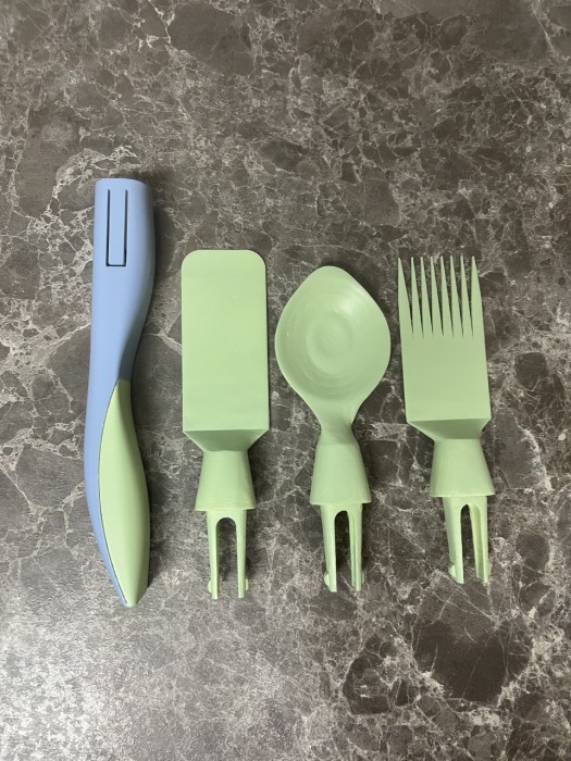 This product is a design solution responding to the following brief. “Produce a system of food preparation tools that have been designed inclusively, to make a user’s experience much more efficient and convenient, and to encourage experimentation resulting in improved confidence towards the activity.” The idea was that students and young adults often struggle with the responsibility of cooking their meals for the first time resulting in poor confidence from lack of experience. Many people within this target market live in shared accommodation or smaller homes like flats and studio apartments meaning that storage and counter space are scarce. This can also impact a person’s ability to experiment in the kitchen as they may have limited tools, utensils and kitchen items due to the lack of space to keep them. Throughout the whole project, the focus was entirely centred on user needs and developing the concept into a practical, considerate design. The outcome was an ergonomic handle and interchangeable utensil heads with a custom locking system. Each part went through testing and development. The locking system, in particular, was changed and improved several times throughout the design process to ensure an entirely feasible result. Each feature was created with a purpose; no decisions were made without careful reflection and reasoning. The outcome was received well by the intended target market.
