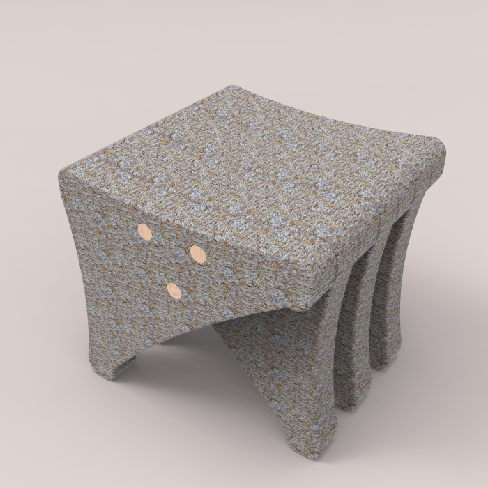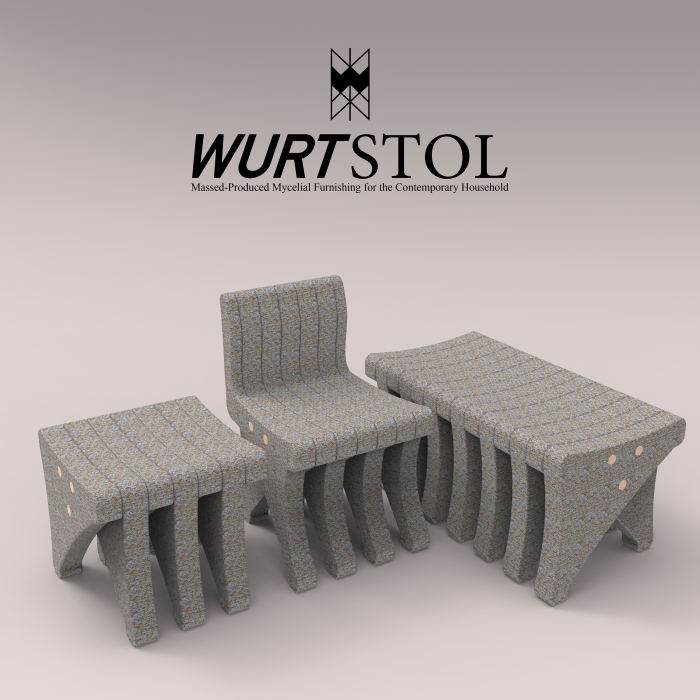 The WURTSTOL seating system seeks to demonstrate the viability of the technique of mycelial moulding in furniture design for the contemporary household in a modular, mass-produced package. WURTSTOL is designed to educate and inform those outside of the design industry of Mycelium’s potential for future design. The system aims to serve as a demonstration as much as it does a set of seats. The multilegged design spreads pressure throughout rather allowing mycelium to support a user’s weight while also offering an unconventional somewhat organic eye-catching aesthetic, allowing WURTSTOL to draw in curious observers to learn about its novel material of choice.