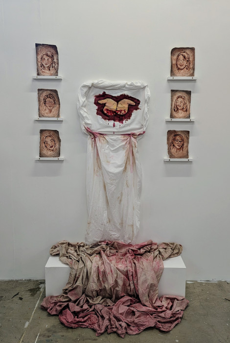 Jess Grant channels her anger towards the alarming rate of women being killed by men in the UK, occurring approximately every three days. Fueled by frustration with the perceived lack of action from authorities and societal tendencies towards victim-blaming, Jess uses real blood in her piece to symbolise the lives lost to male violence and the complicity of bystanders. Urging for proactive measures to end violence against women and girls, she calls for the condemnation of sexism and misogyny, challenging their acceptance as mere jokes. Jess hopes her artwork sparks conversations and drives progress on women’s issues, serving as a poignant memorial to those lost to femicide.