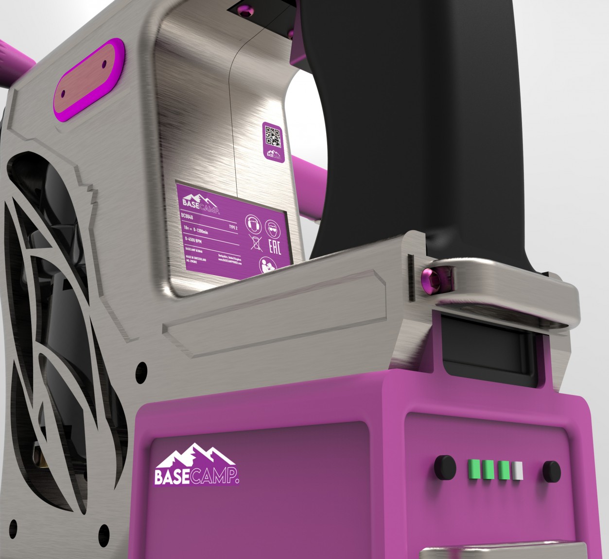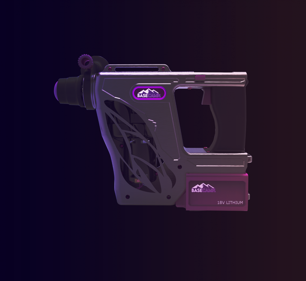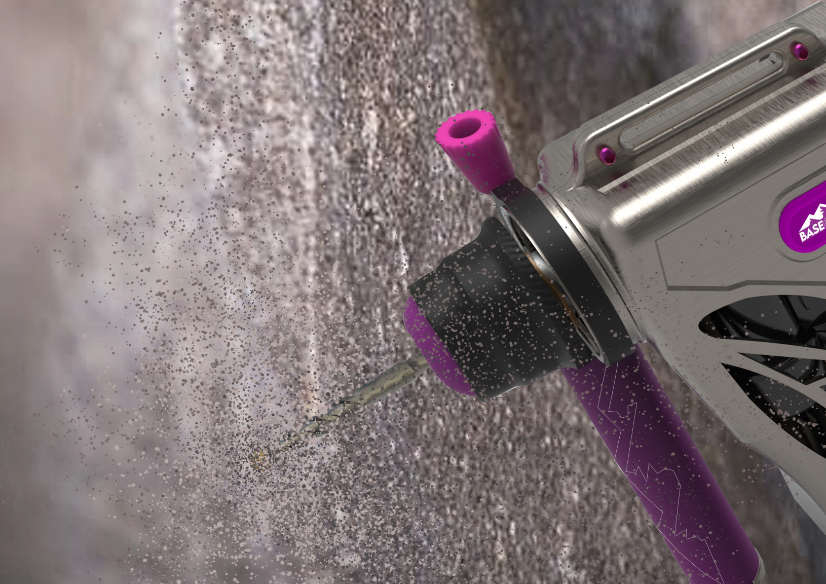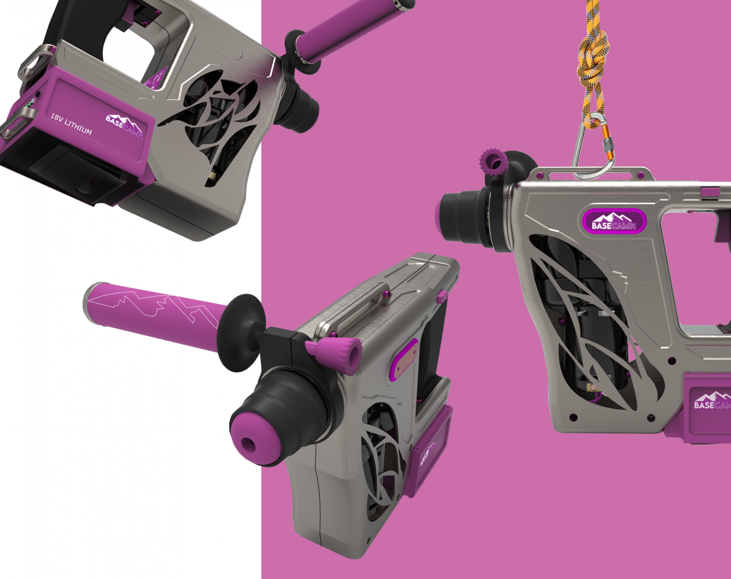 Charles Powell’s BaseCamp SDS has been designed to resolve many of the issues with the construction-based SDS, with a 3d printed titanium body skeletal body that helps to reduce the weight of the drill, multiple attachments for rope and quickdraws.